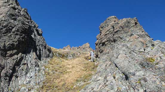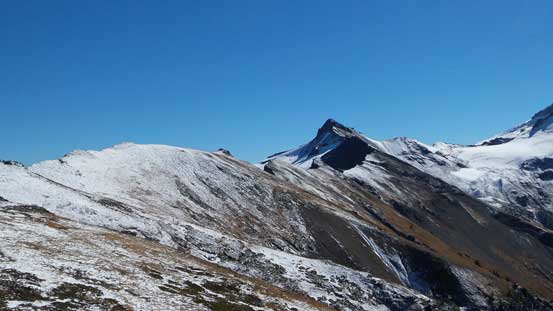 It didn’t take us long to arrive at the highest point on Skyline Divide, which was also the end of this officially maintained trail. After a short but necessary break we descended quite a ways down to the low pass between Skyline Divide and Chowder Ridge. Things started to get a little bit interesting once starting up the other side. There’s a trickier spot with a bit of route-finding and thank to the fresh snow, the rock and grass was slippery making some careful movements. But once through this bit the terrain got easier again, albeit it’s still a long slog even just to get to the base of our objective. From here on we opted to side-hill on climber’s right side of the many bumps along Chowder Ridge to avoid extensive elevation gain/loss/regain.