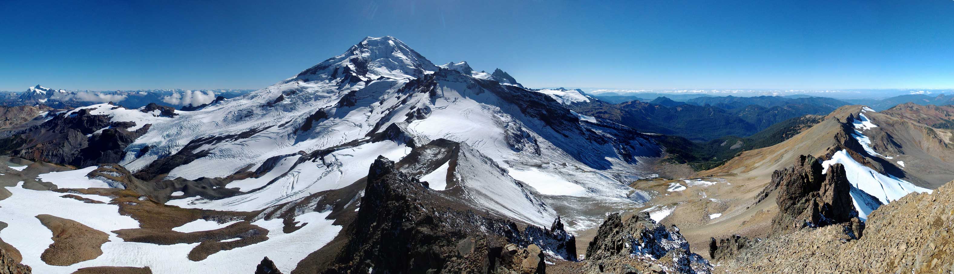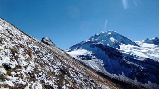 At elevation of close to 2300 m the horn-shaped Hadley Peak is not a small one by the North Cascades standard, but doesn’t seem to raise that much attention comparing to other 2300-meter objectives such as Mt. Rexford. The reason is simple – it’s significantly overshadowed by the nearby Mt. Baker, 1000 vertical meters higher and easily the biggest mountain one can see from near Vancouver. Hadley Peak is basically part of of Mt. Baker, but a fairly striking one in its own if you get close enough to it (and will offer some grand views given its location), so when Simon Chesterton (simonc) from ClubTread suggested this objective I instantly agreed. With more than 600 peaks under his belt Simon is one of the most accomplished peak-baggers as far as I know, and I’m glad to finally meet him.