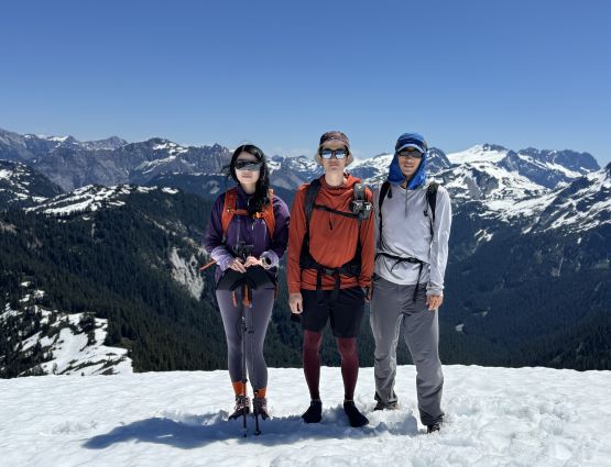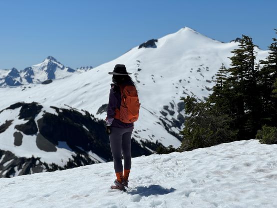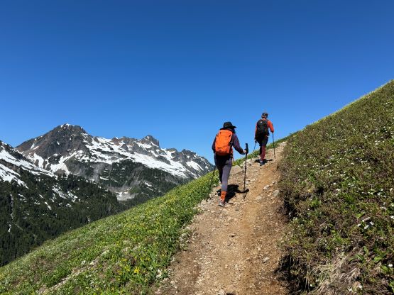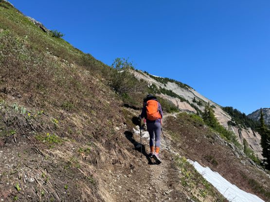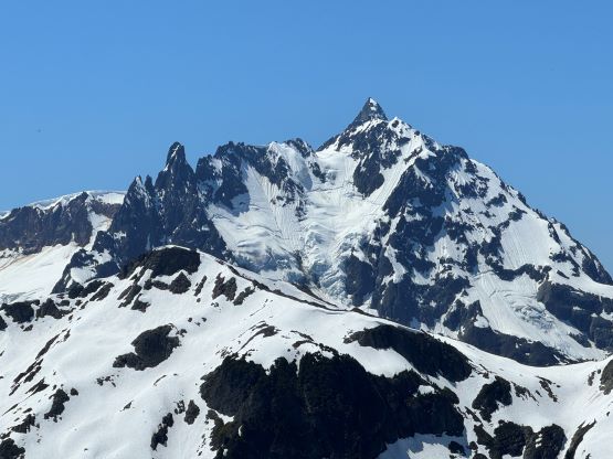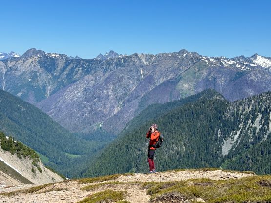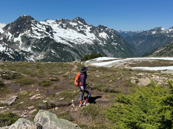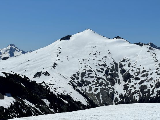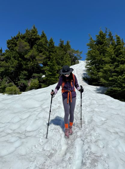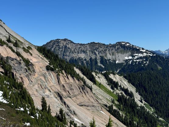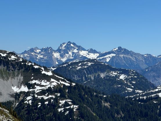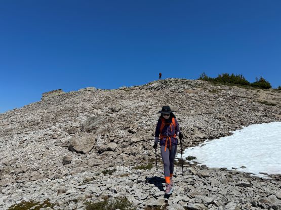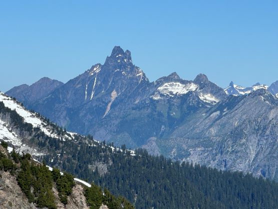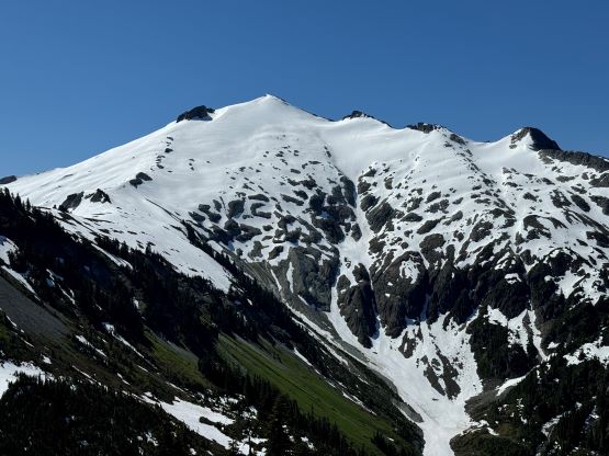 The day was already bright and hot and the actual trail-head was completely full. We had to park on the side of the road about 200 m back, and applied sun protection before even starting the hike. I also needed some extra time to have breakfast so our trail-head routine wasn’t very quick. The 7 km hike to Hannegan Pass was decently scenic with lots of open stretches but the hike itself was mundane and boring. I honestly did not enjoy it as much as I thought I would, probably because I was still in the process of waking up. I had opted to wear only trail-runners without carrying any traction device and I knew there’s some risks with that, but I was very exhausted and desperately needed to lighten the loads. We did encounter some snow fields on the upper south ridge above Hannegan Pass but the snow condition was soft and there were plenty of tracks. The crampons and ice axes were definitely not needed. There weren’t a ton of mosquitoes, thankfully, so we lingered on the summit for quite a while to take a bunch of pictures. The traverse towards Granite Mountain was definitely tempting but I knew I must reserve energy for the travel ahead.