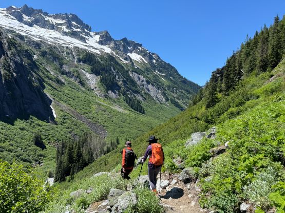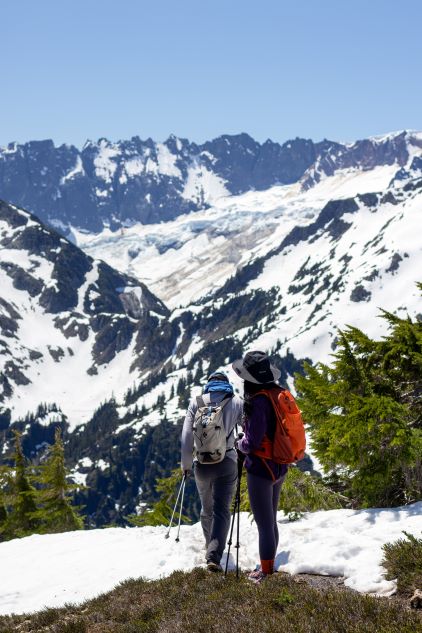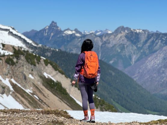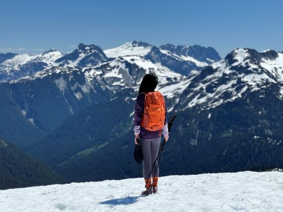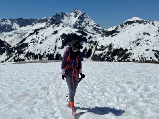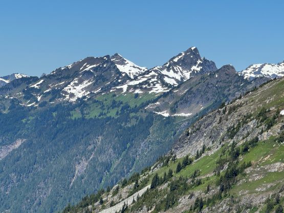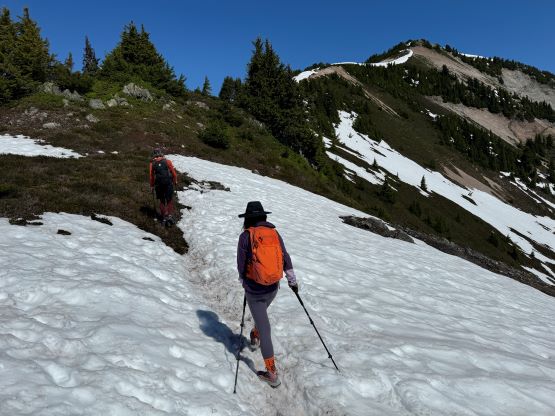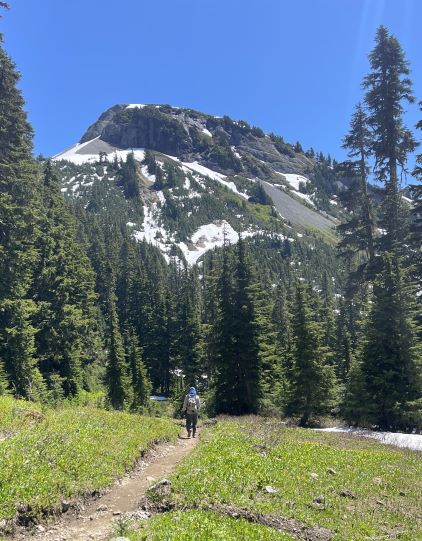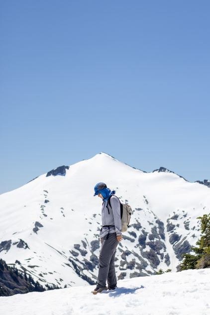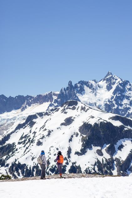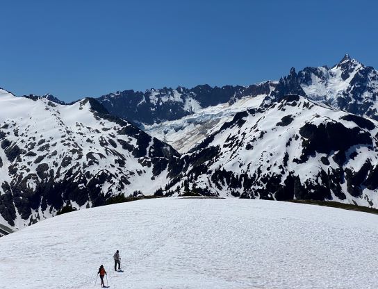 The day was already bright and hot and the actual trail-head was completely full. We had to park on the side of the road about 200 m back, and applied sun protection before even starting the hike. I also needed some extra time to have breakfast so our trail-head routine wasn’t very quick. The 7 km hike to Hannegan Pass was decently scenic with lots of open stretches but the hike itself was mundane and boring. I honestly did not enjoy it as much as I thought I would, probably because I was still in the process of waking up. I had opted to wear only trail-runners without carrying any traction device and I knew there’s some risks with that, but I was very exhausted and desperately needed to lighten the loads. We did encounter some snow fields on the upper south ridge above Hannegan Pass but the snow condition was soft and there were plenty of tracks. The crampons and ice axes were definitely not needed. There weren’t a ton of mosquitoes, thankfully, so we lingered on the summit for quite a while to take a bunch of pictures. The traverse towards Granite Mountain was definitely tempting but I knew I must reserve energy for the travel ahead.