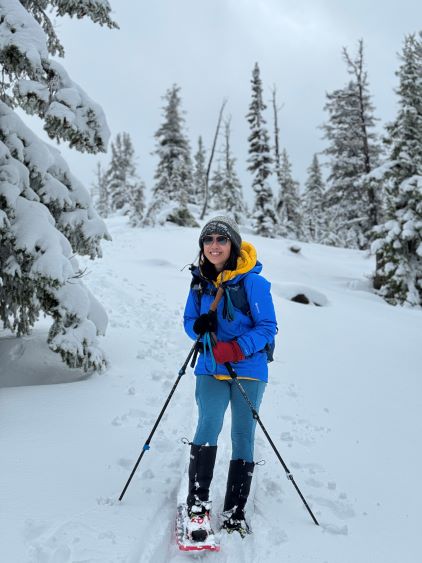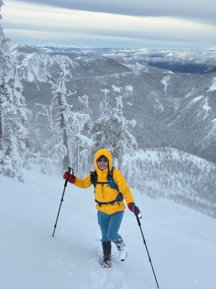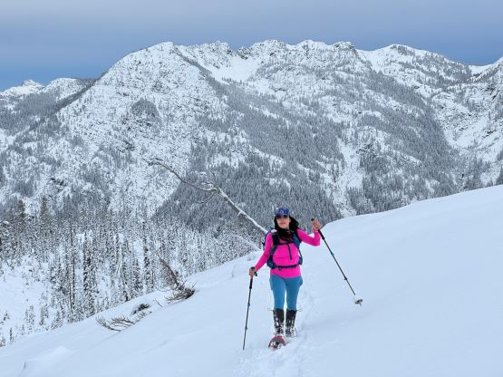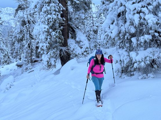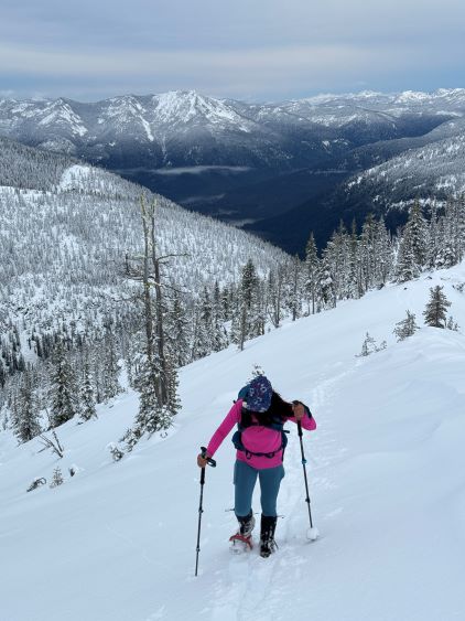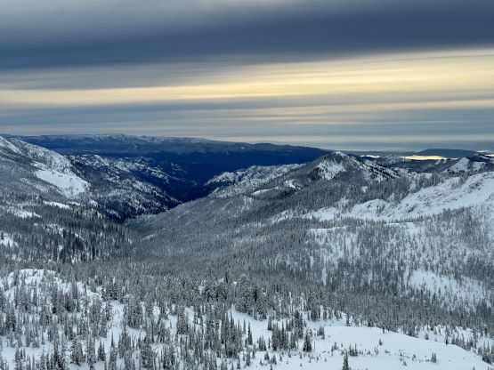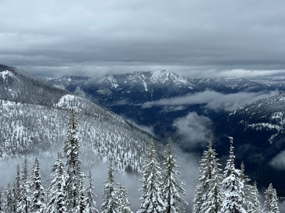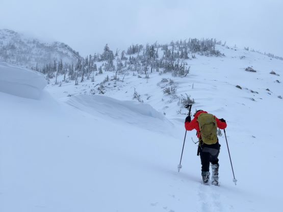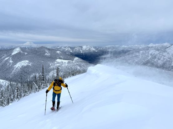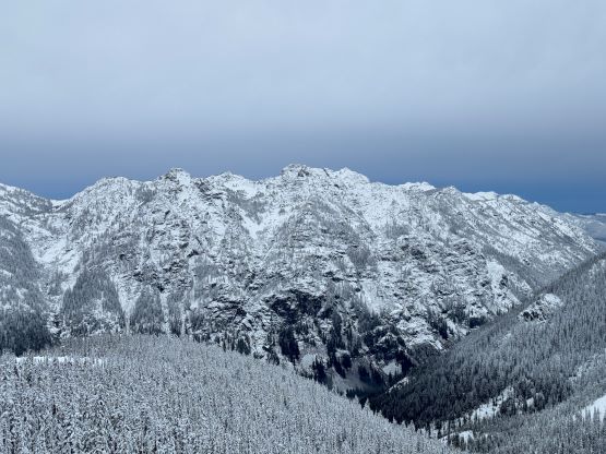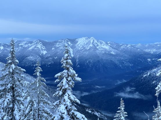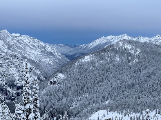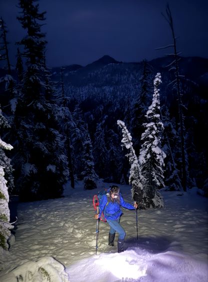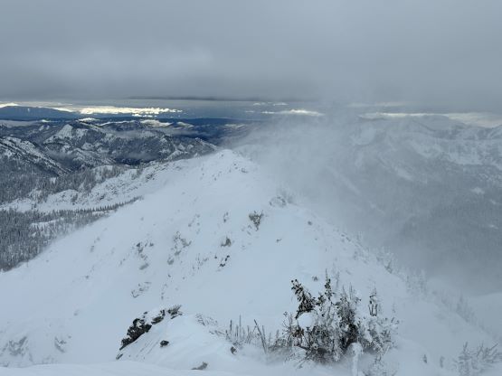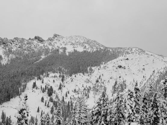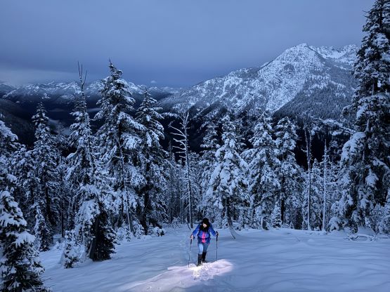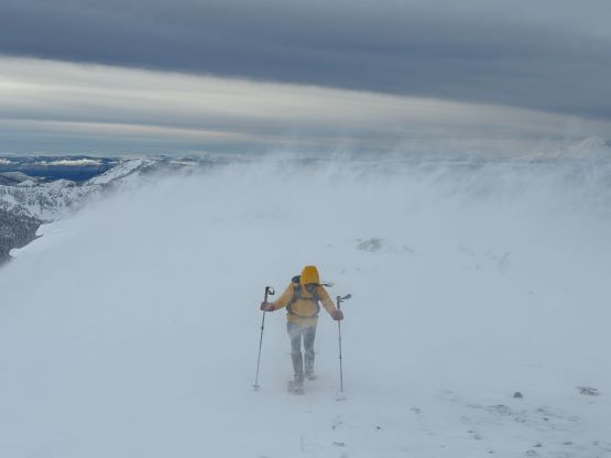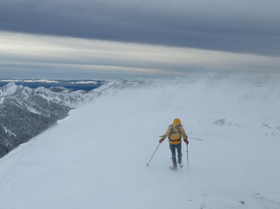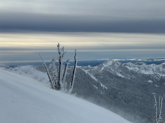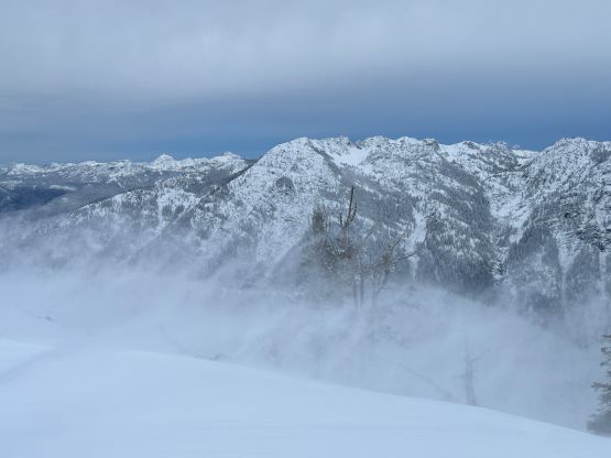 I insisted for us to wake up at 4:20 am in hope for better views in the morning. My trusted forecast models all predicted a clearing trend in the morning. While this trend was correct, the morning weather was still not as good as I was hoping for. It turned out to be completely overcast for the entire day but the clouds were higher and thinner in the morning. The first hour was hiked using head-lamps and the post-holing started immediately after leaving the main trail. I did not bother to figure out the names of these trails as I was just following the trails on the Gaia map. That turn-off was unsigned and not obvious, but I had a habit to check the GPS screen frequently so didn’t miss it. The trail then ascended steeply onto the broad ridge on the divide between Camp and Big Boulder Creeks. There was no existing track and the snow was deep enough (about a foot) that it was no longer possible nor practical to stay on the trail, so we donned snowshoes and started plodding straight up this forested ridge. We did not encounter any notable bushwhacking but the post-holing was brutal. The snowshoes could not provide enough flotation that we basically sank to the ground no matter how deep the snow was. This was because the entire snowpack was laid by one single dump and this was the first day after the precipitation so there’s not enough time for consolidation. We nevertheless plodded to the treeline and were surprised to be welcomed by some fierce ridge-top winds, which was again not in the forecasts. Instead of a pleasant, partly sunny morning all we got was clouds and cold winds. The winds were madly transporting the fresh snow and this was shaping to be a miserable day ahead in the alpine.