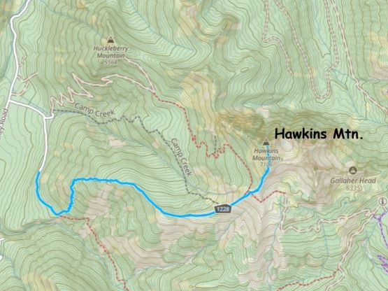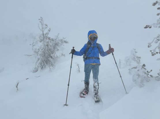 Neither Kate nor I were dressed properly for the 60 km/h winds carrying fresh snow. I did bring enough layers but I did not bring a balaclava nor ski goggles. We plodded into the misery nevertheless and in short time we stopped to don all layers. I started to lead at a snail’s pace because of the lack of visibility and the post-holing, and it’s also important to not sweat too much. Somewhere around 1950 m we found a sheltered spot and I immediately called for a break despite that none of us was feeling hungry. This would be our only spot to eat or drink anything due to the miserable weather ahead, so we must take this oppourtunity. At the same time Kate noticed that she had lost a snowshoe somehow. We descended for about 50 meters but our tracks were already eliminated, and without a shovel I determined that it’s not possible to find that snowshoe, even if we knew where it could roughly be. At this rate this was shaping to be an expensive trip. Despite that, we had to make the summit so we went upwards again. The worst winds were encountered after gaining the south ridge of Hawkins Mtn., that we were starting to lose balance. There were also enough snow that it was no longer practical to use only 1 snowshoe as even with 2 snowshoes I was sinking to knee deep at times. We decided that the best thing was for Kate to find a sheltered spot in a cluster of trees to wait for me tagging the summit.