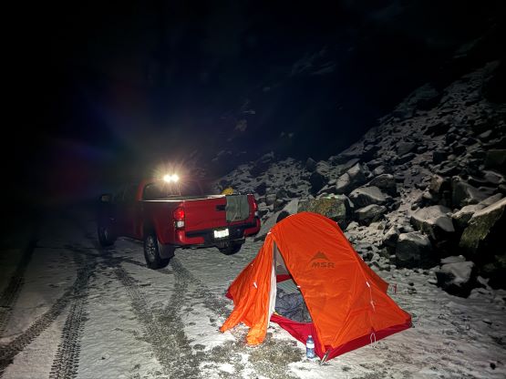 Kate and I left White Rock at around 7:45 pm on Saturday and cruised down the familiar I-5 corridor and then eastwards up I-90 to near Cle Elum. The weather was mostly cloudy as forecasted, but it was raining quite heavily near Snoqualmie Pass. Once entering the village of Roslyn the rain stopped but I immediately got my second ever speed ticket. Oddly for both times I was caught in a small town as I was not paying attention to the supposed slow-down. I had never been caught speeding on freeways as I simply do not speed while driving already fast. The roads in Cle Elum River valley are paved all the way to Salmon la Sac Campground and beyond the end of pavement I turned onto the narrower forestry roads. I had driven this road all the way to Mt. Daniel’s trail-head in 2017 and this time I only needed to drive 1/3 of the total distance. I turned right at the unsigned Camp Creek Road turn-off and drove us all the way to the trail-head. The 2WD vehicles would have to park 1 km earlier at the first fork. These spur roads were high enough (~1000 m elevation) that there’s already a coat of fresh snow on the ground, but did not impose any problem to the Tacoma with 4WD and all terrain tires. The trail-head was not spacious enough to accommodate multiple parties but we had the whole place to ourselves so we easily found flat ground to pitch the tent for a few hours of sleep.