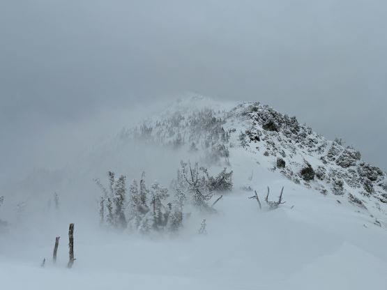 Little did I know that the final summit push would require another hour due to the worsening weather and conditions. The visibility was mostly zero and I had to clean the snow off my sunglasses for every 20 seconds as otherwise I could not even see the immediate ground ahead. The navigation was mostly by the small trees and the exposed rocks on the ridge. It had been a while since I got caught in weather like this. I bypassed the false summit on the west side and I continued side-hilling on some very steep terrain (mostly to avoid the worst of the winds) to near the false/true saddle. The true summit appeared daunting and much farther away than I was hoping for, but I was committed at this point. Thankfully the view was deceiving that the traverse actually didn’t take me too long. What appeared to be steep was actually quite mellow and the biggest challenge was still the blowing snow and the lack of visibility. I took some photos and a selfie and immediately started the descent, following the faint tracks that I made. The tracks were already gone at places but I knew where to roughly aim towards. I also needed to check the GPS a few times to confirm the bearing, and I still needed to wipe the sunglasses a couple times per minute, so the process could not be fast.