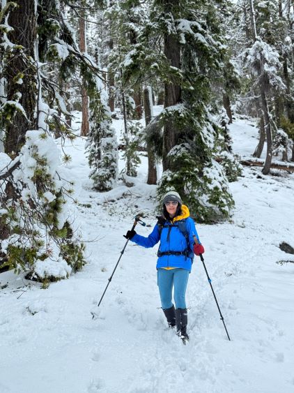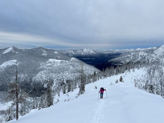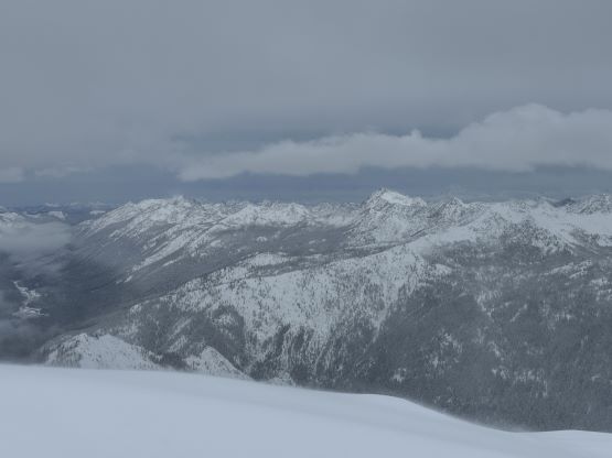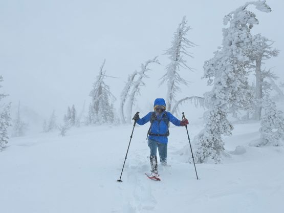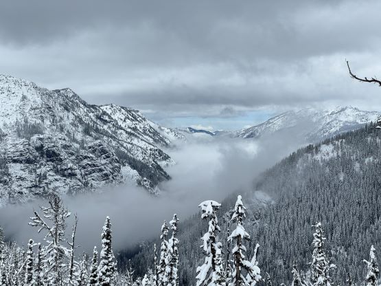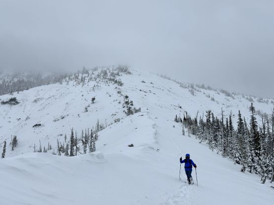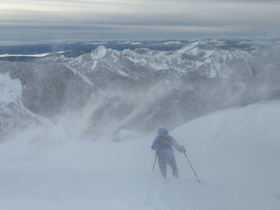 I insisted for us to wake up at 4:20 am in hope for better views in the morning. My trusted forecast models all predicted a clearing trend in the morning. While this trend was correct, the morning weather was still not as good as I was hoping for. It turned out to be completely overcast for the entire day but the clouds were higher and thinner in the morning. The first hour was hiked using head-lamps and the post-holing started immediately after leaving the main trail. I did not bother to figure out the names of these trails as I was just following the trails on the Gaia map. That turn-off was unsigned and not obvious, but I had a habit to check the GPS screen frequently so didn’t miss it. The trail then ascended steeply onto the broad ridge on the divide between Camp and Big Boulder Creeks. There was no existing track and the snow was deep enough (about a foot) that it was no longer possible nor practical to stay on the trail, so we donned snowshoes and started plodding straight up this forested ridge. We did not encounter any notable bushwhacking but the post-holing was brutal. The snowshoes could not provide enough flotation that we basically sank to the ground no matter how deep the snow was. This was because the entire snowpack was laid by one single dump and this was the first day after the precipitation so there’s not enough time for consolidation. We nevertheless plodded to the treeline and were surprised to be welcomed by some fierce ridge-top winds, which was again not in the forecasts. Instead of a pleasant, partly sunny morning all we got was clouds and cold winds. The winds were madly transporting the fresh snow and this was shaping to be a miserable day ahead in the alpine.
