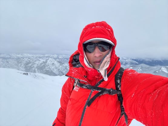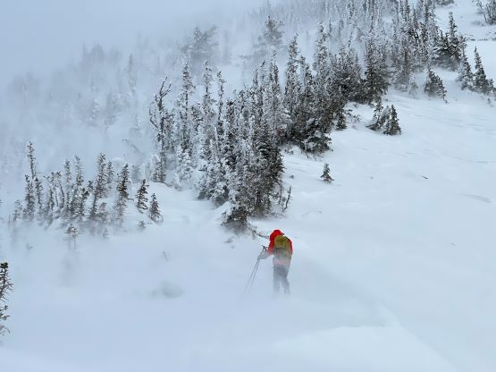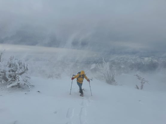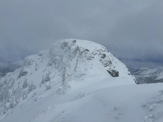 Little did I know that the final summit push would require another hour due to the worsening weather and conditions. The visibility was mostly zero and I had to clean the snow off my sunglasses for every 20 seconds as otherwise I could not even see the immediate ground ahead. The navigation was mostly by the small trees and the exposed rocks on the ridge. It had been a while since I got caught in weather like this. I bypassed the false summit on the west side and I continued side-hilling on some very steep terrain (mostly to avoid the worst of the winds) to near the false/true saddle. The true summit appeared daunting and much farther away than I was hoping for, but I was committed at this point. Thankfully the view was deceiving that the traverse actually didn’t take me too long. What appeared to be steep was actually quite mellow and the biggest challenge was still the blowing snow and the lack of visibility. I took some photos and a selfie and immediately started the descent, following the faint tracks that I made. The tracks were already gone at places but I knew where to roughly aim towards. I also needed to check the GPS a few times to confirm the bearing, and I still needed to wipe the sunglasses a couple times per minute, so the process could not be fast.