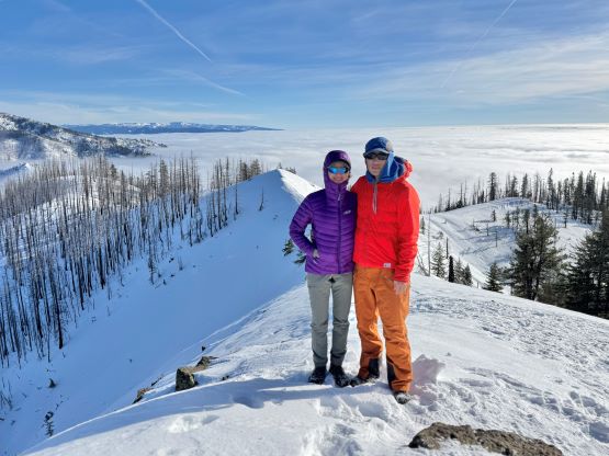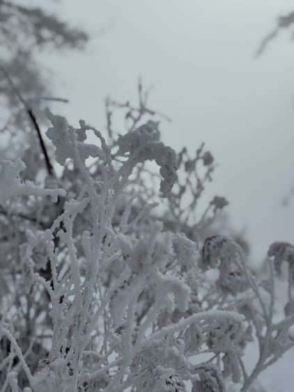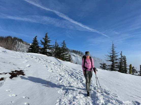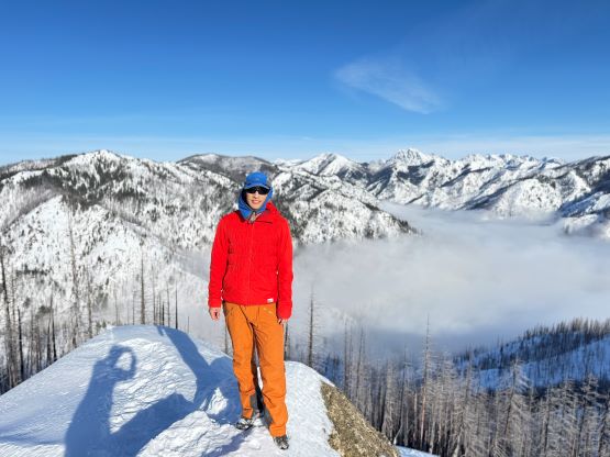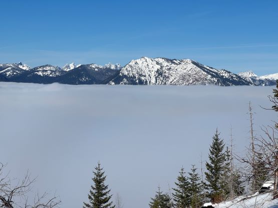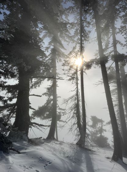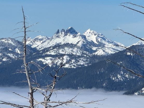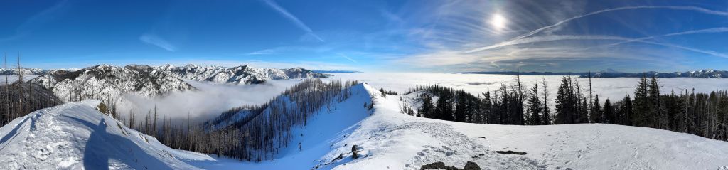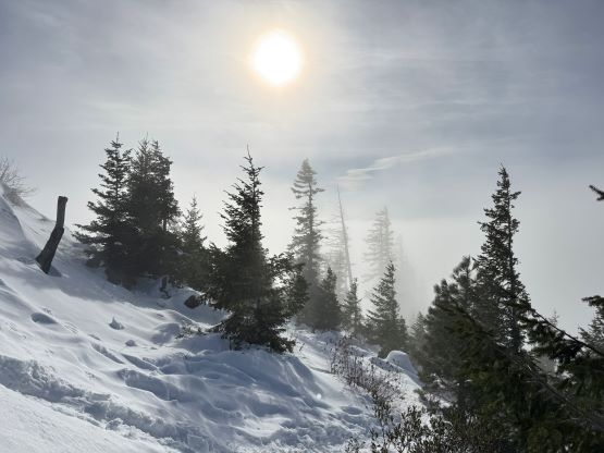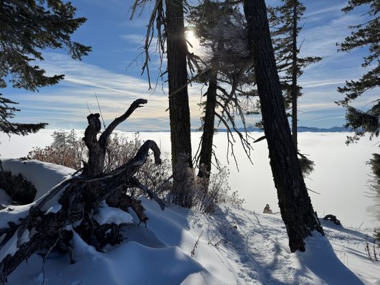 The weather was cold and overcast which was contrary to the forecast, but based on the past experience I thought this might be an inversion. I was definitely correct. The first few kilometers was plodding up the private FSR and can be confusing without a map. We almost made a mistake at the second (yellow) gate. The tire tracks all went left but the correct hiker’s route goes through that yellow gate. About halfway up the mountain we finally finished the FSR plodding and arrived at the official trail-head, and the trail was well packed by hikers’ traffics. We only encountered one other group of hikers (on our descent) but apparently this route was still very popular despite the recent change in the access situation. Thank to the foot traffics we never ended up needing the snowshoes. At around 1250 m elevation which was 2/3 of the way up the mountain we finally broke through the inversion layer. This was Erica’s first time above the sea of clouds so our stoke level was very high. The rest of the ascent was longer than expected and there was substantial amount of plodding in the forest, but the summit itself offered even better views.