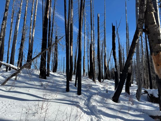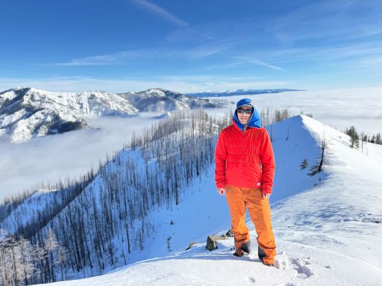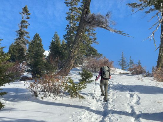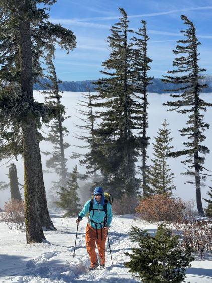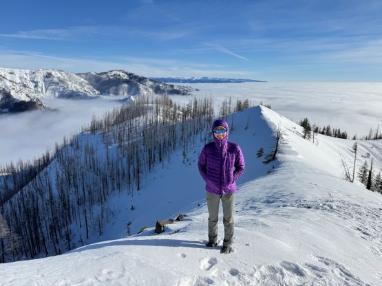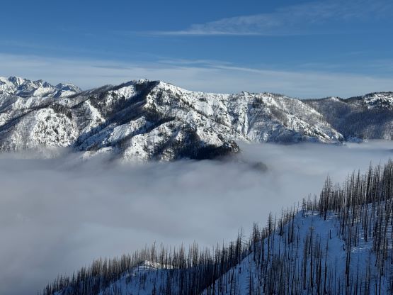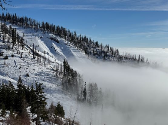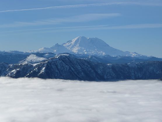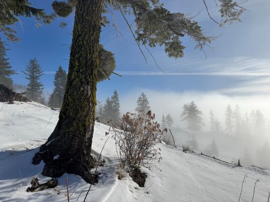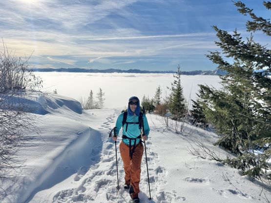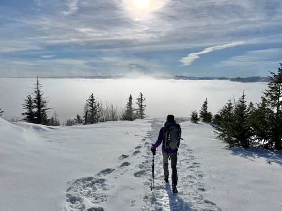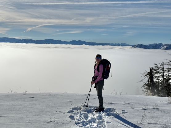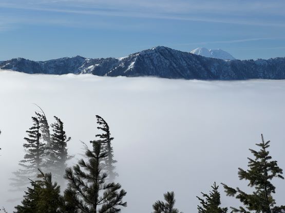 The weather was cold and overcast which was contrary to the forecast, but based on the past experience I thought this might be an inversion. I was definitely correct. The first few kilometers was plodding up the private FSR and can be confusing without a map. We almost made a mistake at the second (yellow) gate. The tire tracks all went left but the correct hiker’s route goes through that yellow gate. About halfway up the mountain we finally finished the FSR plodding and arrived at the official trail-head, and the trail was well packed by hikers’ traffics. We only encountered one other group of hikers (on our descent) but apparently this route was still very popular despite the recent change in the access situation. Thank to the foot traffics we never ended up needing the snowshoes. At around 1250 m elevation which was 2/3 of the way up the mountain we finally broke through the inversion layer. This was Erica’s first time above the sea of clouds so our stoke level was very high. The rest of the ascent was longer than expected and there was substantial amount of plodding in the forest, but the summit itself offered even better views.