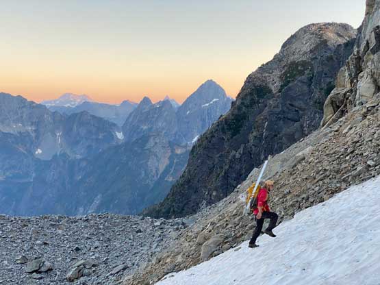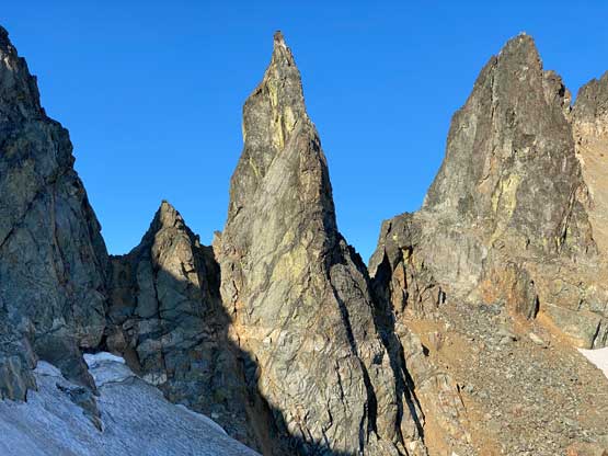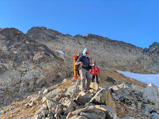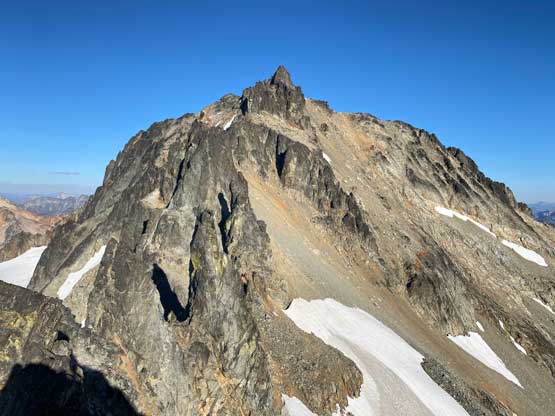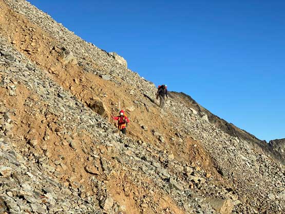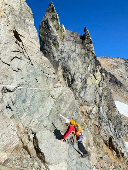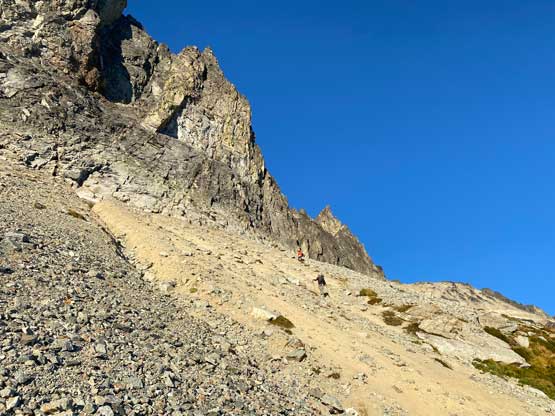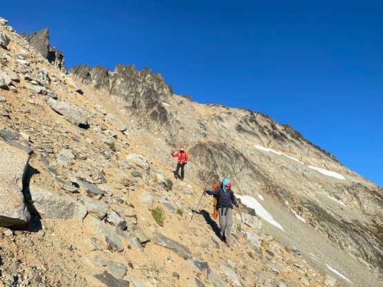 We did one rappel using the 60m twin rope and scrambled back down to the ditched packs. From there it would be a long and grueling slog to descend but we faced the challenge one at a time. The first step was to get off Horseshoe Peak via the regular route which still involved fair amount of choss. After joining our Buckner’s route we made the final decision to retrace what we had done earlier in the morning via the higher level traverse, instead of taking Eric’s previous routes lower down. This might not have saved time, but at this stage of a day we wanted to stick to the known.