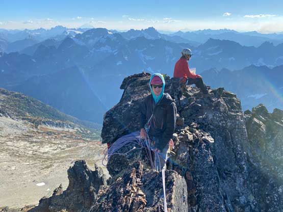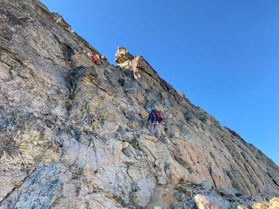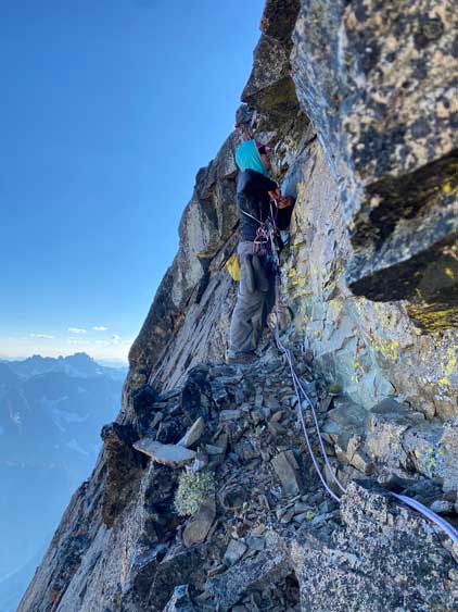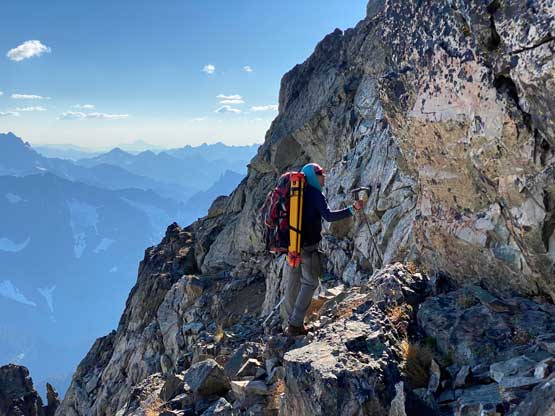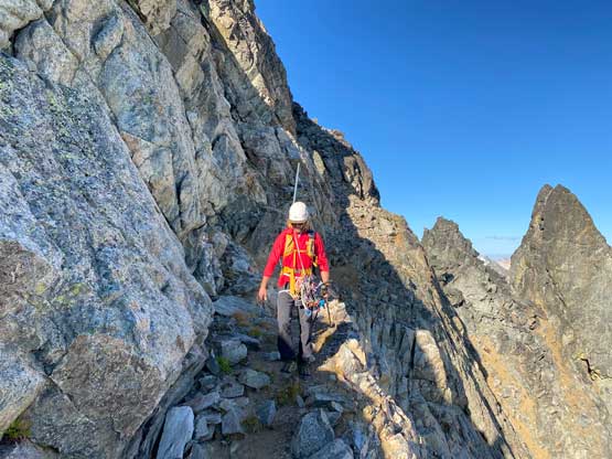 It took me longer at the transition as I had to carry the rope while the others went ahead to scout out the route. We scrambled more choss onto a higher, narrower ledge and that’s where the climbing began. The start of this higher ledge was only 4th class but with lethal exposure. Talon soloed across including pulling up that class 5 step at the end whereas Eric opted to lead with a rope. I gave Eric a belay from behind and followed afterwards. I was glad to have a belay at the technical step as it was considerably more challenging than expected. If I were to solo that step I would likely want to pull onto the rappel slings as the rocks were outwards sloping and not particularly solid. The true summit only had enough room for one person whereas the register was placed onto a lower boulder.