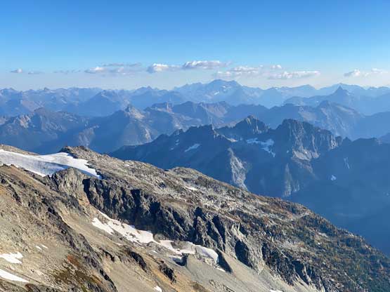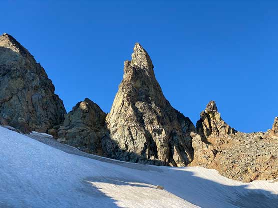 Horseshoe Peak is the highest on “Ripsaw Ridge” that connects Boston Peak to Buckner Mountain but in reality it’s just a pimple on the west ridge of Buckner Mountain. This peak does not even boast 50 m prominence. The inclusion in the fabled Bulger List is the sole reason why people bother to climb it. However, from technical perspective Horseshoe Peak is more interesting than Buckner Mountain as even the easiest route involves some 5th class climbing near the top, whereas Buckner Mountain is just a slog on choss and/or snow. My interest in Horseshoe Peak was also because of the Bulger inclusion and in the end I was glad that I did it as the climbing was quite fun. This was already the tailing end of a huge day. Eric, Talon and I started at 1 am, climbed Buckner Mountain‘s twin summits with professional level surveying equipment, and then did the first ascent of the west face of Lick of Flame. It was already 14-15 hours into the trip when we finished Lick of Flame. We were tired but we had to carry on to finish the mission.