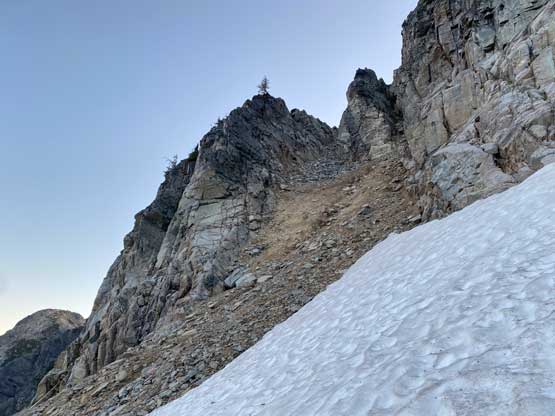 There are two routes to get onto the technical part of Horseshoe Peak and from the base of Lick of Flame it made more sense to tackle the longer “climber’s right variation” across a very cool ledge higher up on the face. This was not the one that Eric did years ago during his Bulger List quest. We were too stubborn to put on crampons so did some sketchy 4th class scrambling around the snow, which on hindsight probably had taken more than than donning crampons. We then traversed across more choss to the base of Horseshoe Peak. Eric led the next section scrambling into a chimney with one stiffer move near the exit. The exit of this chimney dumped us onto that infamous ledge, which was much wider than expected. We ran across the ledge due south to join the regular route and ditched the packs there.