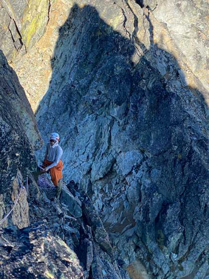 It took me longer at the transition as I had to carry the rope while the others went ahead to scout out the route. We scrambled more choss onto a higher, narrower ledge and that’s where the climbing began. The start of this higher ledge was only 4th class but with lethal exposure. Talon soloed across including pulling up that class 5 step at the end whereas Eric opted to lead with a rope. I gave Eric a belay from behind and followed afterwards. I was glad to have a belay at the technical step as it was considerably more challenging than expected. If I were to solo that step I would likely want to pull onto the rappel slings as the rocks were outwards sloping and not particularly solid. The true summit only had enough room for one person whereas the register was placed onto a lower boulder.