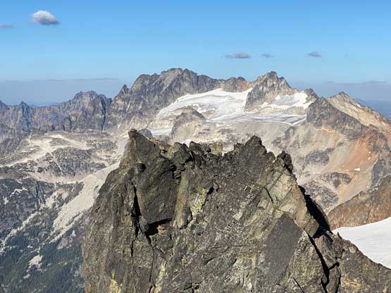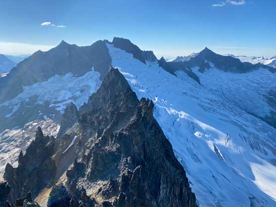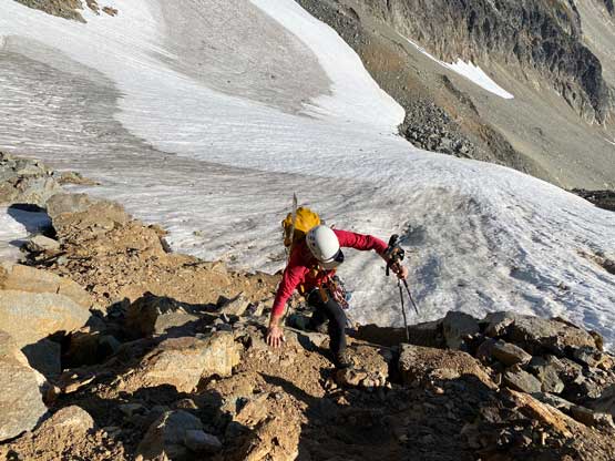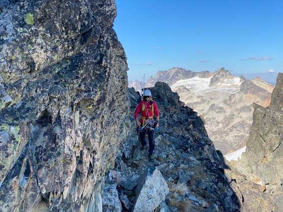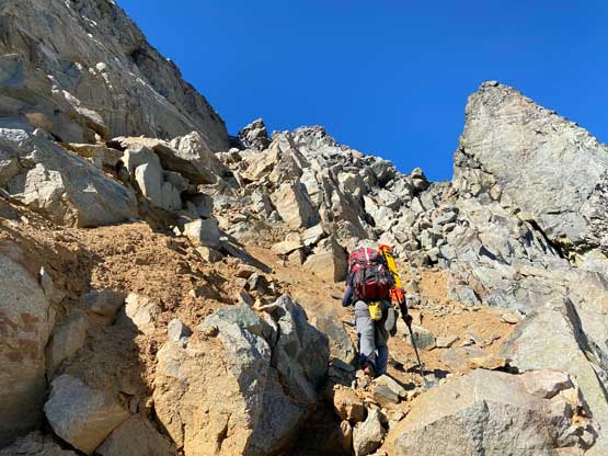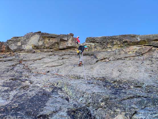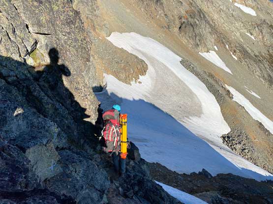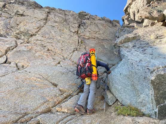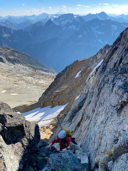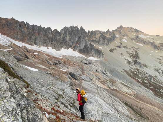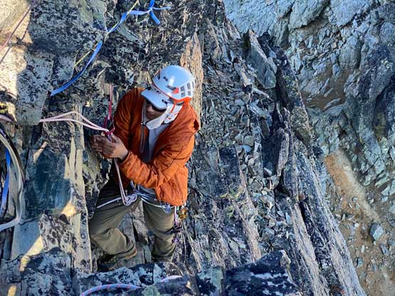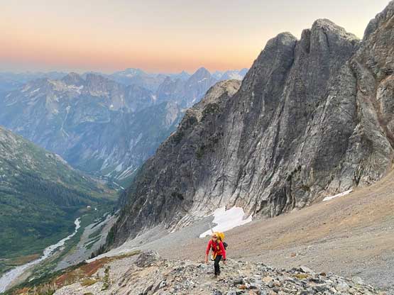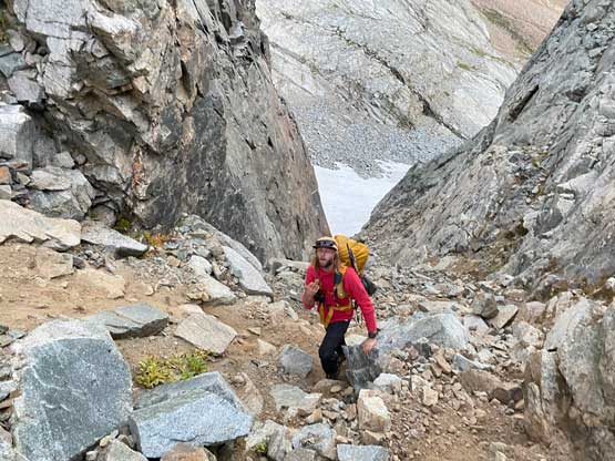 We did one rappel using the 60m twin rope and scrambled back down to the ditched packs. From there it would be a long and grueling slog to descend but we faced the challenge one at a time. The first step was to get off Horseshoe Peak via the regular route which still involved fair amount of choss. After joining our Buckner’s route we made the final decision to retrace what we had done earlier in the morning via the higher level traverse, instead of taking Eric’s previous routes lower down. This might not have saved time, but at this stage of a day we wanted to stick to the known.