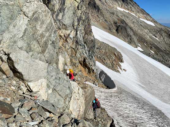 There are two routes to get onto the technical part of Horseshoe Peak and from the base of Lick of Flame it made more sense to tackle the longer “climber’s right variation” across a very cool ledge higher up on the face. This was not the one that Eric did years ago during his Bulger List quest. We were too stubborn to put on crampons so did some sketchy 4th class scrambling around the snow, which on hindsight probably had taken more than than donning crampons. We then traversed across more choss to the base of Horseshoe Peak. Eric led the next section scrambling into a chimney with one stiffer move near the exit. The exit of this chimney dumped us onto that infamous ledge, which was much wider than expected. We ran across the ledge due south to join the regular route and ditched the packs there.