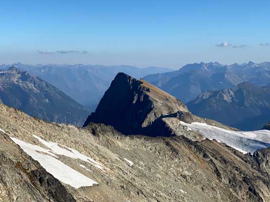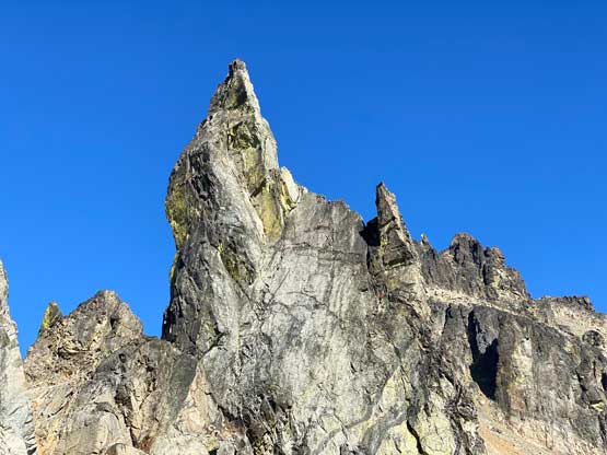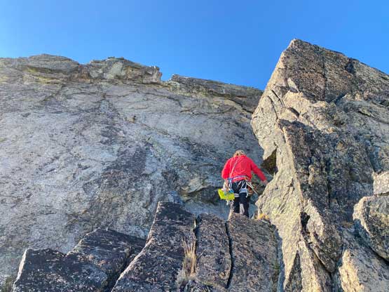Horseshoe Peak is the highest on “Ripsaw Ridge” that connects Boston Peak to Buckner Mountain but in reality it’s just a pimple on the west ridge of Buckner Mountain. This peak does not even boast 50 m prominence. The inclusion in the fabled Bulger List is the sole reason why people bother to climb it. However, from technical perspective Horseshoe Peak is more interesting than Buckner Mountain as even the easiest route involves some 5th class climbing near the top, whereas Buckner Mountain is just a slog on choss and/or snow. My interest in Horseshoe Peak was also because of the Bulger inclusion and in the end I was glad that I did it as the climbing was quite fun. This was already the tailing end of a huge day. Eric, Talon and I started at 1 am, climbed Buckner Mountain‘s twin summits with professional level surveying equipment, and then did the first ascent of the west face of Lick of Flame. It was already 14-15 hours into the trip when we finished Lick of Flame. We were tired but we had to carry on to finish the mission.