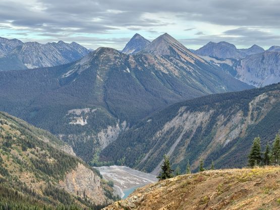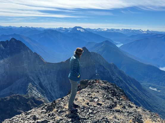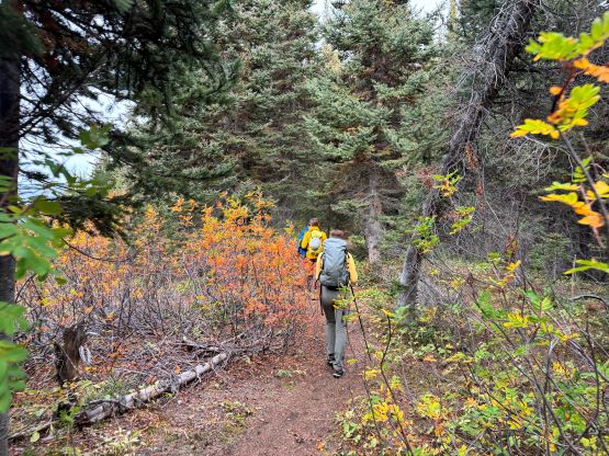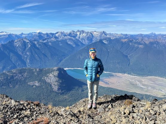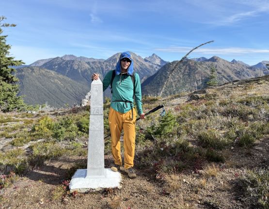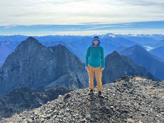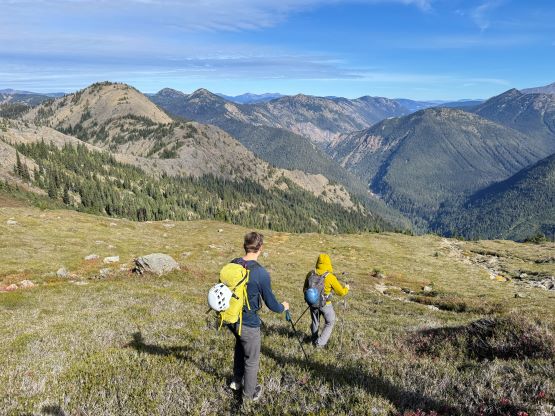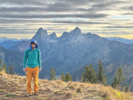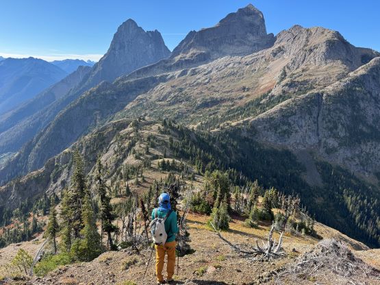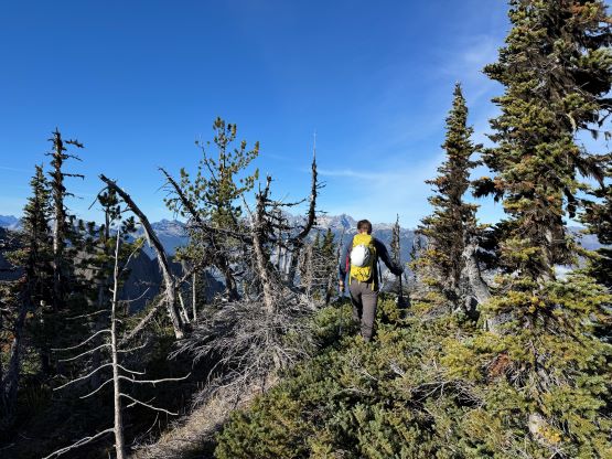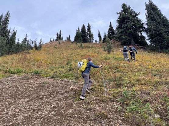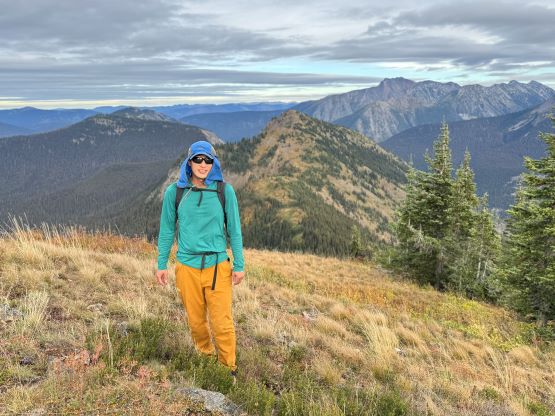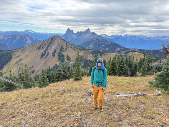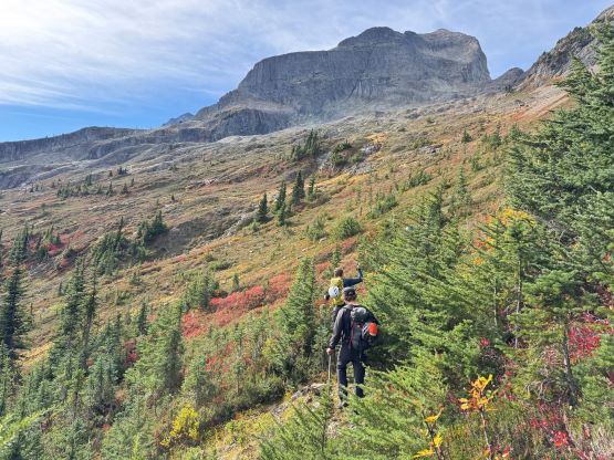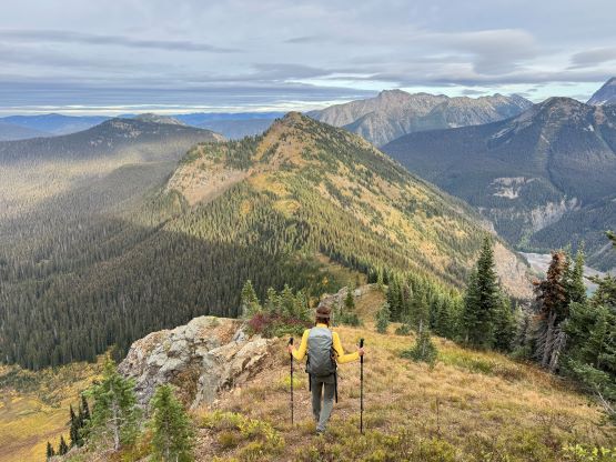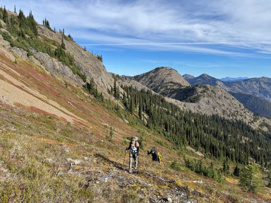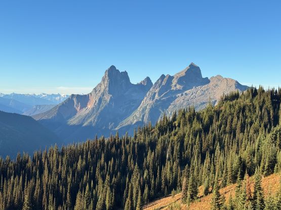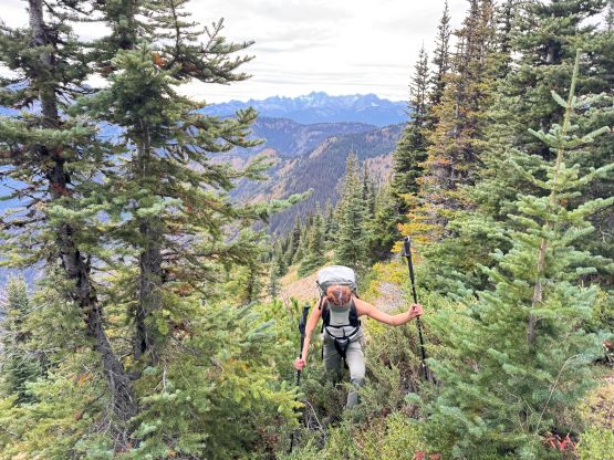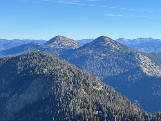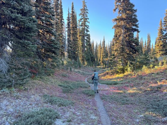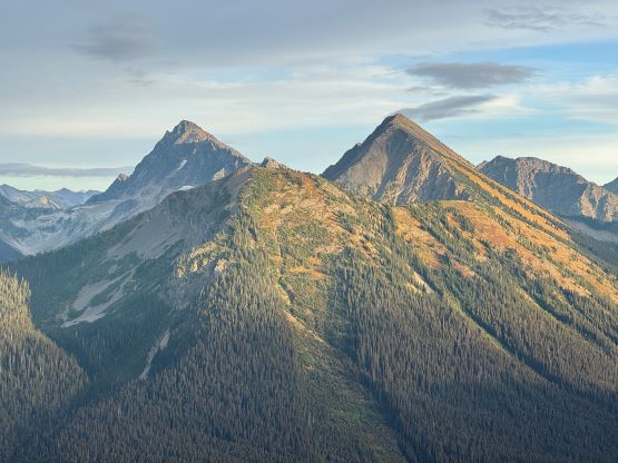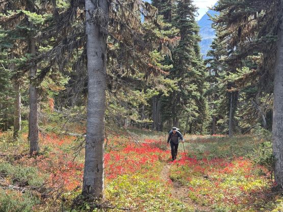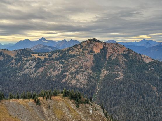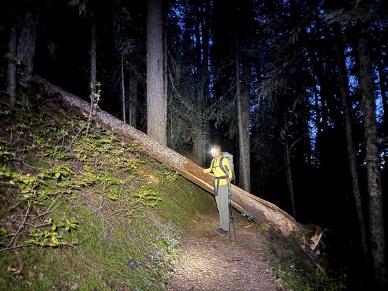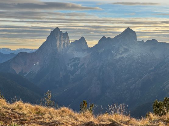 At this point I was committed to finish the project so I would push onward to tag Lone Goat and Snow Camp with or without the pain. I was thankfully still able to run most of the downhills and Alex found a better way traversing down to Red/Lone Goat saddle. The traverse involved more steep side-hilling on grass but had minimal elevation regain. The NW Ridge of Lone Goat might be the hardest route on this peak and was a 150 m straight up ascent on 40-degree grass. I thought this route would not be doable in the early morning hours due to the frost so we were definitely lucky to be here at the warmest time of a day. After taking another much-needed break on the top we jogged down the east ridge to finally rejoin the Skyline trail. Francis, Alex and Trevor had already climbed Snow Camp Mtn. years ago so they decided to skip it. I told Francis to go ahead to get home earlier whereas Erica and I must carry on to tag the last peak. We mostly used Matt’s route up the steep south side and took another long break on the summit. It was getting to that “golden hour” so the scenery was actually improving. I also needed to really stretch my legs as the muscles and tentons were able to give up. Erica needed to switch her shoes back to the runners after we got down into the forest so I took that as another oppourtunity to take another long break stretching the legs. We did not push too hard on the final 8 km plod back to the parking lot but we still jogged a good portion of the downhills, finishing the round trip in under 14 hours, covering 44 km and 2800 m gain according to the Gaia app, which is known to underestimate the stats. The others had already gone by the time we got back to the trail-head and I was too tired and hungry to go anywhere. Thankfully Erica and I had come prepared with rice and curries so we made our own food and then drove home afterwards. The “short drive” was a nice change for us and I even got back home well before midnight.