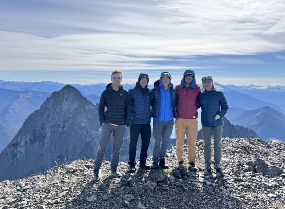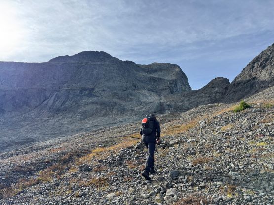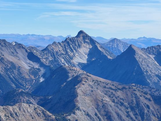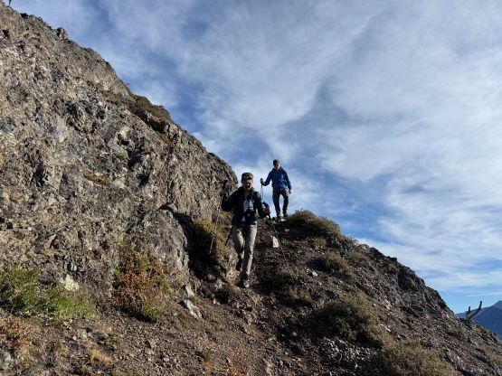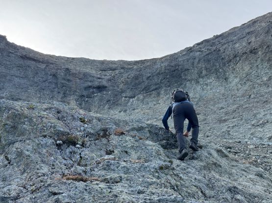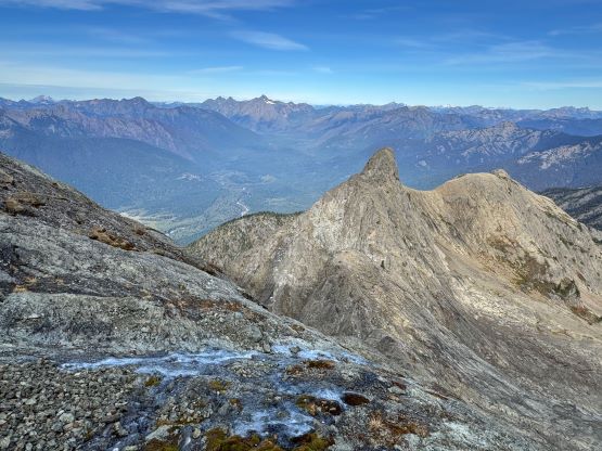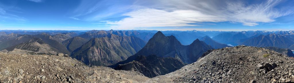 We donned helmets and ditched the poles, but I still opted to carry one pole to the summit which I definitely appreciated especially on the descent. For the lower headwall I thought the attack was on the far climber’s right side (admittedly I did almost no research beside downloading Matt’s GPX track), but upon closer inspection I thought the right hand was too difficult to be the correct way. Francis was leading the middle of the wall and I finally checked the track and sure enough, Matt had detoured to the far climber’s left. Erica and I eventually traversed into Francis’ route and we climbed a section of 4th class and then exited towards right on a ramp system. This was the crux for our route as there were plenty of verglass in the area making the route-finding tricky. The terrain was also down-sloping, so those without climbing experience might find this terrifying. The middle draw was almost always covered in snow according to the old trip reports even in the late summer, but the permanent snow had long gone these days. For us it was a tedious slog on treadmill scree and unstable rubbles to the obvious ramp that brought us climber’s right onto the NW Ridge proper. Some people had climbed a crack/chimney system on the climber’s left of the ridge but we thought taking the ridge was the best idea. There’s one really exposed 3rd class stretch on questionable rocks but the rest of the route was easy class 2 cruise sailing. It had taken us 5 hours 40 minutes to reach the summit, beating Matt/Miranda/Mel’s time by exactly 1 hour so we took our time taking a break up there. The views were excellent but there were signs of fresh snow towards almost all directions, so we were definitely lucky on this success.