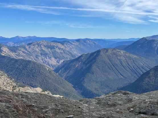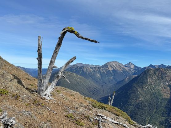 It was then my turn to lead us back across that undulating Hozameen Ridge. I again thought about taking the bypass but decided against it at the very end, so up and over that P100m bump we went. A bit of technical-ish running later we started grunting upwards again, and I thought we surely had gained 100 m in the next stage so I went to the maps and looked for the contour lines. I was hoping that the next bump could be another P100m objective. I was not correct after consulting with the Peakbagger app, but I was not far off. This one boasts 96 m prominence so for the Americans (using P300 feet as the cut-off) it would still count, so I must log it. My legs were already giving me troubles but I ignored the pain and led us running all the way down to Movich Camp where we took the next break. It was about 1 pm so I ate an entire sandwich but was still hungry afterwards. I thought I had brought too much food but I was not correct. We had already decided to bag all of the peaks in one batch of grab so the next section would be the grueling 400 m gain to the summit of Red Mountain. This is the highest in the area boasting over 300 m prominence, and required fair amount of detouring off-trail. Trevor led the bushwhacking upwards onto the SW Ridge but then we had to make some annoying side-hilling to traverse around a few bumps. The final grunt up the SW Ridge took forever that I was thoroughly beat by the time I slogged to the summit. I was the last to reach this summit and that was not very normal for me.