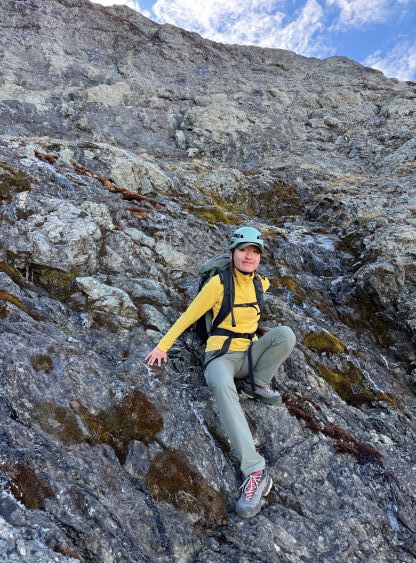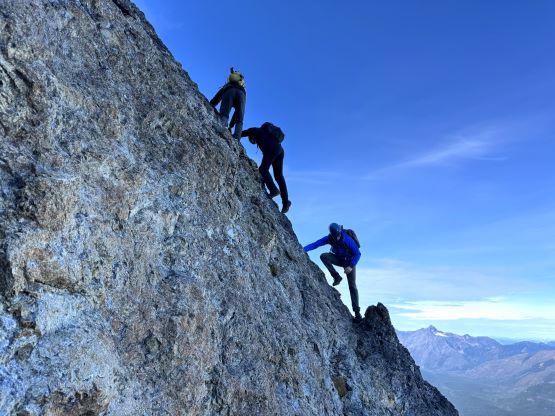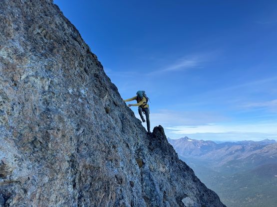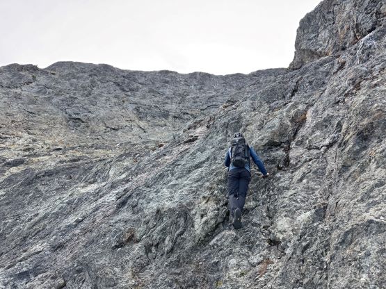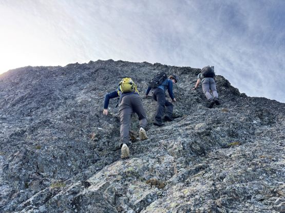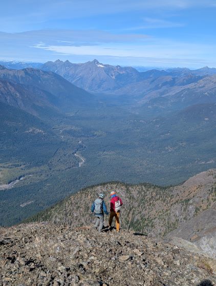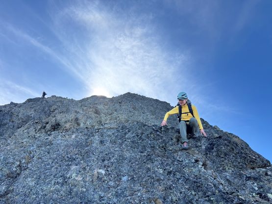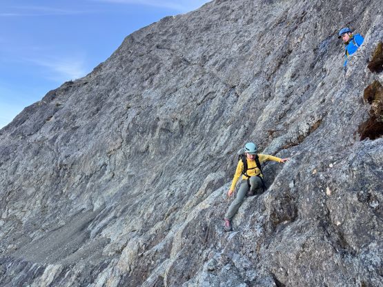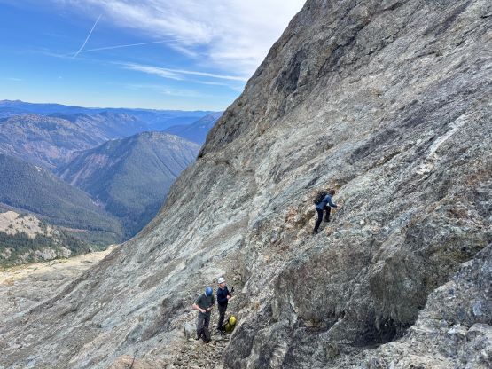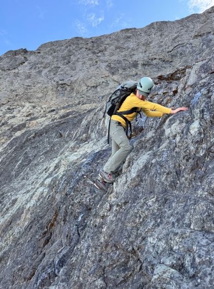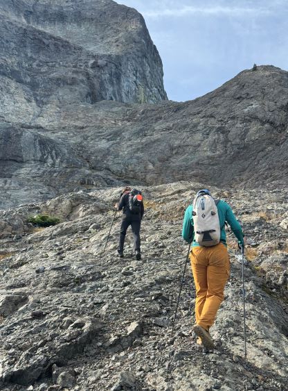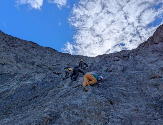 After taking in enough of the scenery I decided to head down first with Erica. I expected Erica to be quite a bit slower on the descent than the rest of the climbers in this team given her limited experience but I was wrong. Erica was mostly able to keep up with me and I was not on purposely slowing down. In the end she did not slow anyone down and I was thoroughly impressed, because it was the descent that made me appreciate the seriousness of this mountain. The nature of the terrain made this one of those mountains that the descent was much harder than the ascent. For the lower headwall I decided to take a variation which turned out to be just as difficult, if not worse. I spotted a likely 3rd class route but it turned out to be covered in a lot of verglass. I was forced to do a few climbing moves to traverse out of the questionable zone. Erica, Francis and Trevor followed me whereas Alex found a faster way on the side. While the route was not horribly loose by our standards, managing rock fall in a group of five was not straightforward. We then again, took a long break at that one-and-only source of water before committing to the 20 km death march out.