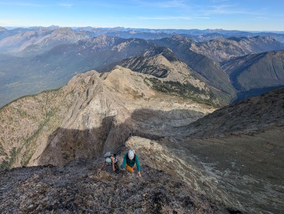 Hozomeen Mtn. is an iconic double-peak massif dominating the north end of Ross Lake while boasting over 1100 m prominence. The rarely climbed south tower is considered one of the 10 hardest peaks in Washington by the easiest possible routes. The north tower is nowhere as difficult but still has reputation of being sketchy. The standard route via the NW Ridge does not seem probable until one’s literally at the bottom of it. There is a great range of variety on the opinions of the difficulty but after doing it I generally agree with the majority that it’s mostly 3rd class with odd bits of 4th class. The terrain is somewhat loose (nowhere as bad as the Goodsirs), down-sloping, extremely exposed but not protectable so I also understand why even some of the experienced climbers found this demanding or couldn’t even make the summit. I had been eyeing this objective for at least 8 years and the general consensus back in the days was to time that narrow window in the early summer when the lower headwall’s still filled in with snow. This would surely offer the easiest climbing but then crampons etc. would also be required. For one reason or another this never ended up happening for me. The “beta” had changed over the last couple years, that apparently a late season snow-free ascent has now become the standard practice. Shayan M. was the first to report this route in the late summer while not being sketched out, and the following year Chris G. made a solo run in sub-10-hour round trip, calling it “mostly class 2”. Numerous groups had since climbed it in similar conditions and most agreed with the “class 3/4” rating, so why not ditch the snow equipment and make it a light-and-fast single day push.
