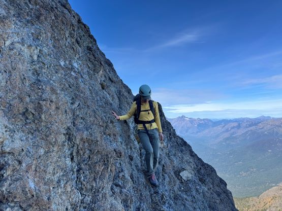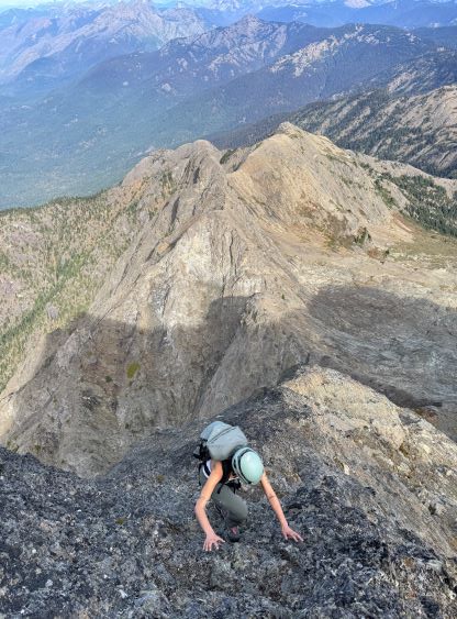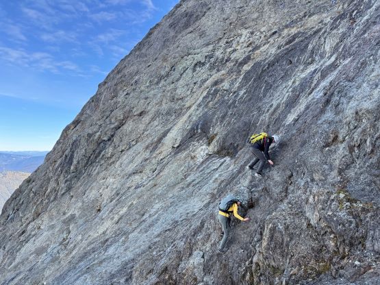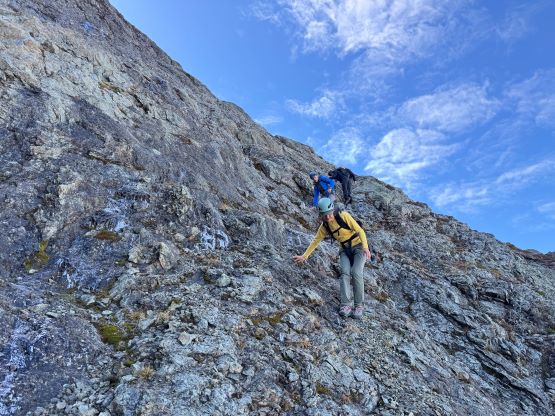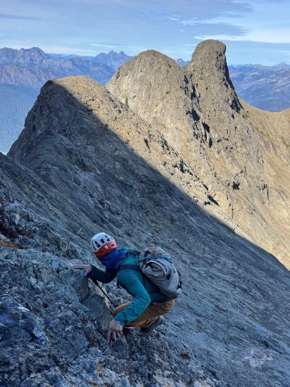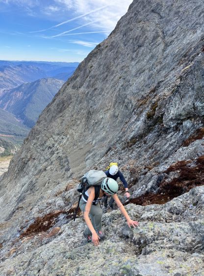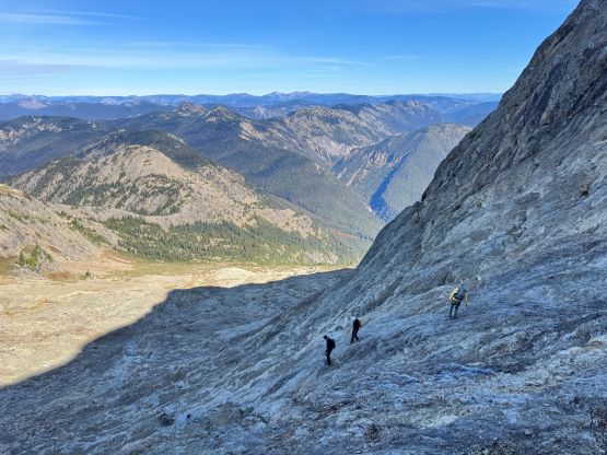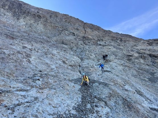 After taking in enough of the scenery I decided to head down first with Erica. I expected Erica to be quite a bit slower on the descent than the rest of the climbers in this team given her limited experience but I was wrong. Erica was mostly able to keep up with me and I was not on purposely slowing down. In the end she did not slow anyone down and I was thoroughly impressed, because it was the descent that made me appreciate the seriousness of this mountain. The nature of the terrain made this one of those mountains that the descent was much harder than the ascent. For the lower headwall I decided to take a variation which turned out to be just as difficult, if not worse. I spotted a likely 3rd class route but it turned out to be covered in a lot of verglass. I was forced to do a few climbing moves to traverse out of the questionable zone. Erica, Francis and Trevor followed me whereas Alex found a faster way on the side. While the route was not horribly loose by our standards, managing rock fall in a group of five was not straightforward. We then again, took a long break at that one-and-only source of water before committing to the 20 km death march out.