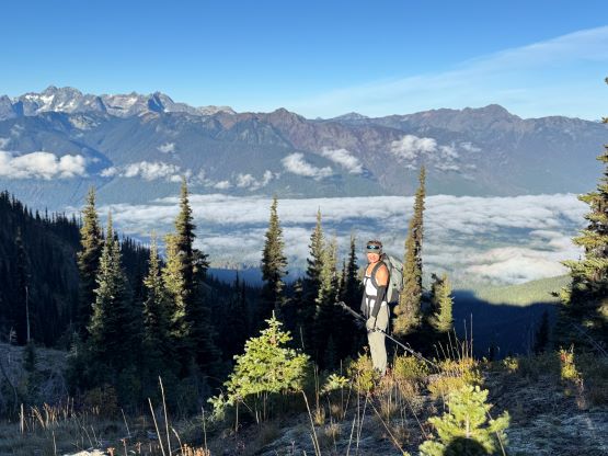 It was then my turn to lead us back across that undulating Hozameen Ridge. I again thought about taking the bypass but decided against it at the very end, so up and over that P100m bump we went. A bit of technical-ish running later we started grunting upwards again, and I thought we surely had gained 100 m in the next stage so I went to the maps and looked for the contour lines. I was hoping that the next bump could be another P100m objective. I was not correct after consulting with the Peakbagger app, but I was not far off. This one boasts 96 m prominence so for the Americans (using P300 feet as the cut-off) it would still count, so I must log it. My legs were already giving me troubles but I ignored the pain and led us running all the way down to Movich Camp where we took the next break. It was about 1 pm so I ate an entire sandwich but was still hungry afterwards. I thought I had brought too much food but I was not correct. We had already decided to bag all of the peaks in one batch of grab so the next section would be the grueling 400 m gain to the summit of Red Mountain. This is the highest in the area boasting over 300 m prominence, and required fair amount of detouring off-trail. Trevor led the bushwhacking upwards onto the SW Ridge but then we had to make some annoying side-hilling to traverse around a few bumps. The final grunt up the SW Ridge took forever that I was thoroughly beat by the time I slogged to the summit. I was the last to reach this summit and that was not very normal for me.