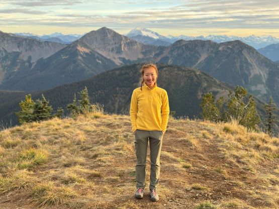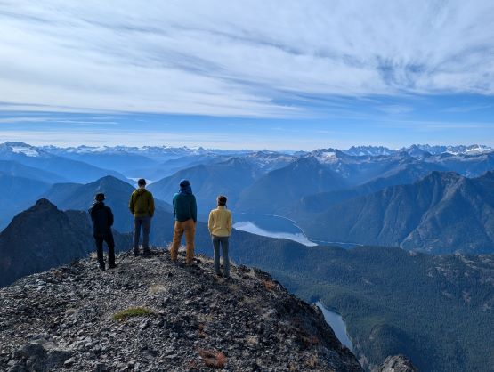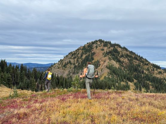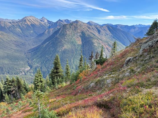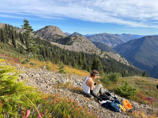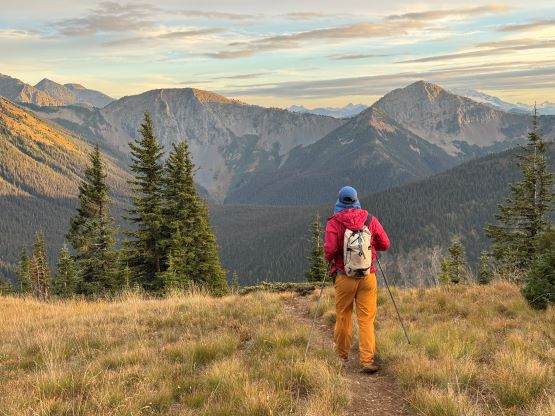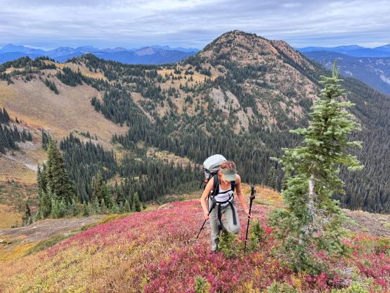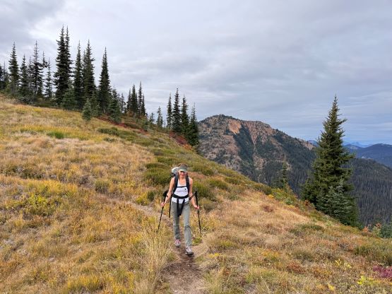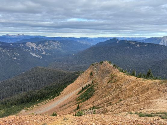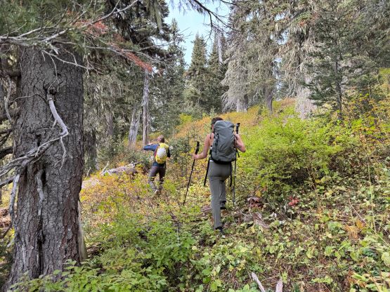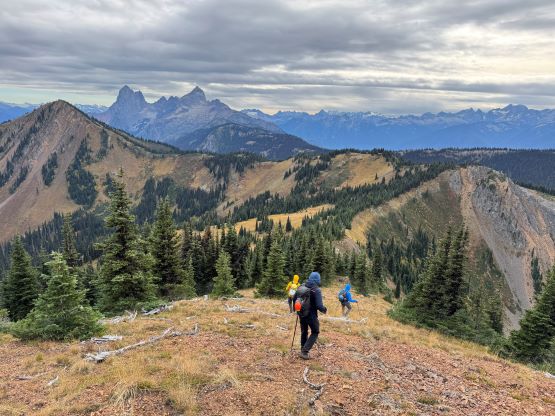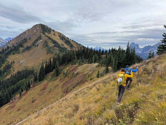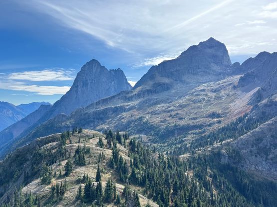 At this point I was committed to finish the project so I would push onward to tag Lone Goat and Snow Camp with or without the pain. I was thankfully still able to run most of the downhills and Alex found a better way traversing down to Red/Lone Goat saddle. The traverse involved more steep side-hilling on grass but had minimal elevation regain. The NW Ridge of Lone Goat might be the hardest route on this peak and was a 150 m straight up ascent on 40-degree grass. I thought this route would not be doable in the early morning hours due to the frost so we were definitely lucky to be here at the warmest time of a day. After taking another much-needed break on the top we jogged down the east ridge to finally rejoin the Skyline trail. Francis, Alex and Trevor had already climbed Snow Camp Mtn. years ago so they decided to skip it. I told Francis to go ahead to get home earlier whereas Erica and I must carry on to tag the last peak. We mostly used Matt’s route up the steep south side and took another long break on the summit. It was getting to that “golden hour” so the scenery was actually improving. I also needed to really stretch my legs as the muscles and tentons were able to give up. Erica needed to switch her shoes back to the runners after we got down into the forest so I took that as another oppourtunity to take another long break stretching the legs. We did not push too hard on the final 8 km plod back to the parking lot but we still jogged a good portion of the downhills, finishing the round trip in under 14 hours, covering 44 km and 2800 m gain according to the Gaia app, which is known to underestimate the stats. The others had already gone by the time we got back to the trail-head and I was too tired and hungry to go anywhere. Thankfully Erica and I had come prepared with rice and curries so we made our own food and then drove home afterwards. The “short drive” was a nice change for us and I even got back home well before midnight.