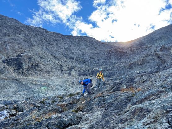 We donned helmets and ditched the poles, but I still opted to carry one pole to the summit which I definitely appreciated especially on the descent. For the lower headwall I thought the attack was on the far climber’s right side (admittedly I did almost no research beside downloading Matt’s GPX track), but upon closer inspection I thought the right hand was too difficult to be the correct way. Francis was leading the middle of the wall and I finally checked the track and sure enough, Matt had detoured to the far climber’s left. Erica and I eventually traversed into Francis’ route and we climbed a section of 4th class and then exited towards right on a ramp system. This was the crux for our route as there were plenty of verglass in the area making the route-finding tricky. The terrain was also down-sloping, so those without climbing experience might find this terrifying. The middle draw was almost always covered in snow according to the old trip reports even in the late summer, but the permanent snow had long gone these days. For us it was a tedious slog on treadmill scree and unstable rubbles to the obvious ramp that brought us climber’s right onto the NW Ridge proper. Some people had climbed a crack/chimney system on the climber’s left of the ridge but we thought taking the ridge was the best idea. There’s one really exposed 3rd class stretch on questionable rocks but the rest of the route was easy class 2 cruise sailing. It had taken us 5 hours 40 minutes to reach the summit, beating Matt/Miranda/Mel’s time by exactly 1 hour so we took our time taking a break up there. The views were excellent but there were signs of fresh snow towards almost all directions, so we were definitely lucky on this success.