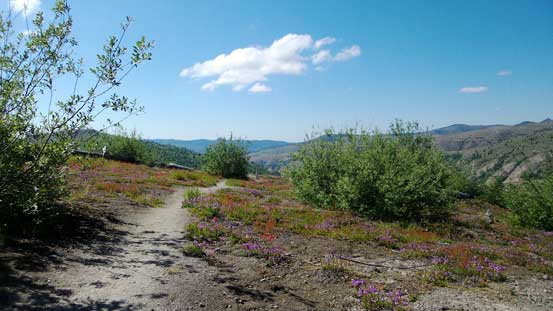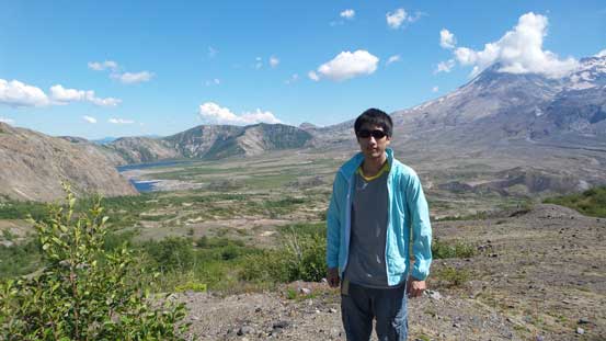 It’s about 2.5 hours from Seattle to the parking lot at the end of SR 504. I drove the first half, down southwards along I-5 and then Yujia took over the second half eastwards along SR 505 and SR 504. The road trip itself was more scenic than expected since much of the terrain was along open ridge crests. The downside was the heat. We didn’t make to the parking lot until almost 1 pm and it’s apparent that the sun was beating down on full force. The hike to the summit of Johnston Ridge was actually on a wheelchair accessible paved trail, with no difficulty whatsoever. After grabbing some obligatory pictures we immediately turned our attention to the trail ahead.