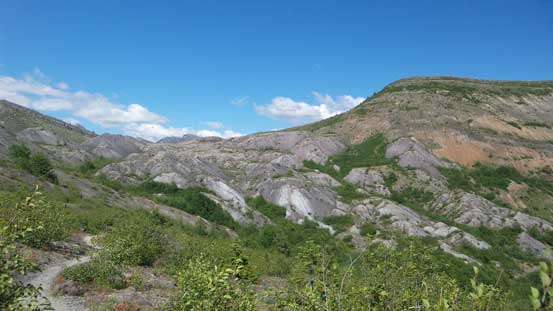 But before moving on we had to find a somewhat shaded place to have lunch. We brought up some luxury food from our previous day’s dinner and I believe it was my first time eating crabs on (near) a mountain top.. Back to the hike itself, we had no difficulty following the trail down to a broad saddle. There’s some elevation loss involved but not by much. Upwards and onwards the trail stayed on climber’s left side of the ridge crest, bypassing a bump and then we arrived at another saddle.