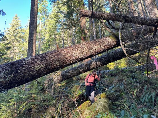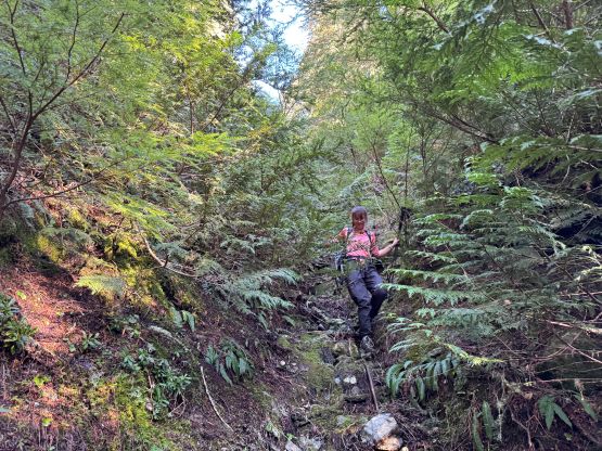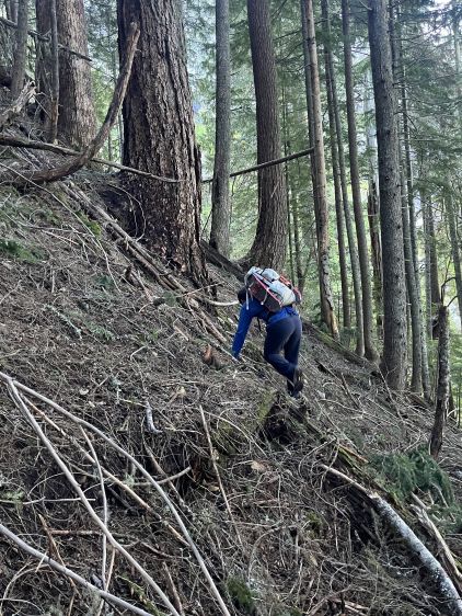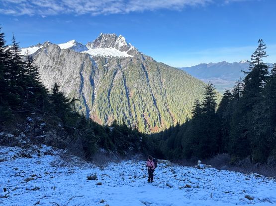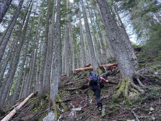 There was no recent update about the logging roads to Square Creek TH so there’s some unknowns. We indeed were not able to drive to the very end but the extra walking distance was less than a kilometer. The November flooding definitely did some damages to the area. I opted to wear the trusty Arc’teryx Alpine Vertex for as much as possible while carrying the La Sportiva G5s for the snow climbing up high. This turned out to be carrying the boots all the way to the snow traverse at 1350 m elevation. The spot to leave Square Creek Trail was indeed marked by a cairn but the best navigation tool these days was definitely the GPS app. Both of us checked the GPS screens multiple times to make sure we didn’t miss the turn. The climber’s access trail was not in an inspiring shape that even with the GPX track we lost it multiple times in the bushes. The bushwhacking wasn’t too annoying but we must be very careful about the navigation.