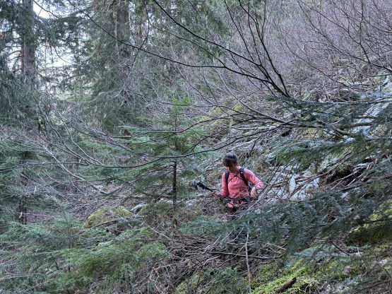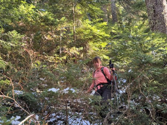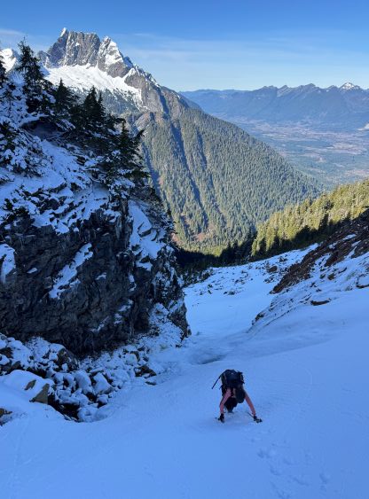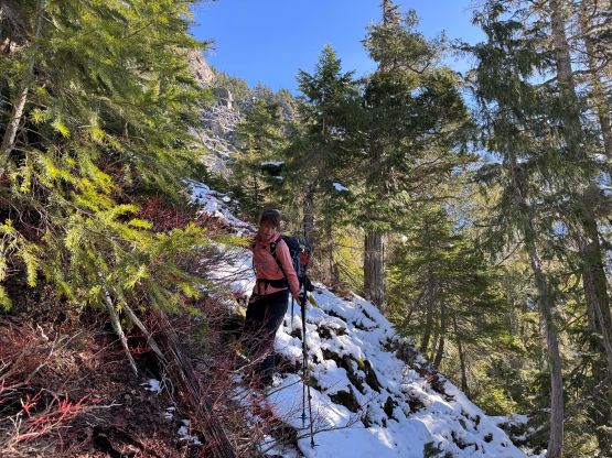 Higher up we somehow lost the route and went too far climber’s left. Thankfully Elise caught our mistake by checking the tracks. To correct the mistake we did a short but nasty traverse through alders and other types of bushes. Once on route we still had to traverse across some steep forested terrain without a trail bed, but the bushwhacking was minimal. It didn’t take us long to reach the first gully which required a bit of thrashing to get down into. Normally this part would be already filled with snow but not in this year. The first gully turned out to be boulder fields covered in an inch of fresh snow for us, which made things annoying to say the least. I thought about to switch footwear at this point but was too lazy to do so, so kept pushing in the trail runners. The worst was the short but steep and bushy slope to get out of the first gully. My hands were cold and wet from the vege-belaying. Elise was smart enough to take her time donning gloves. The terrain above this first gully was steep and complicated but the fresh snow stayed within an inch deep, that I was able to lead us all the way to the snow traverse in the trail shoes.