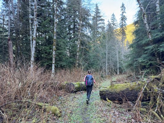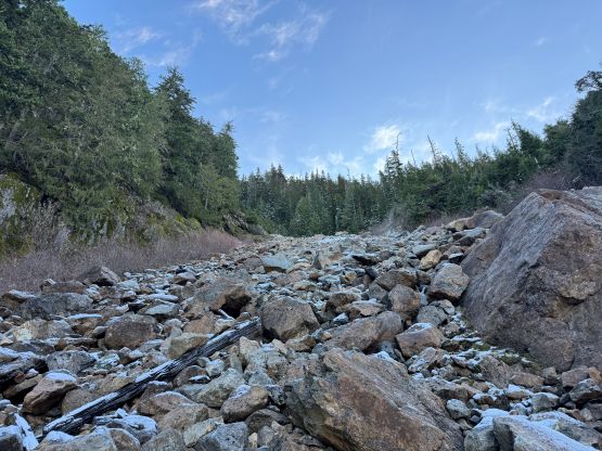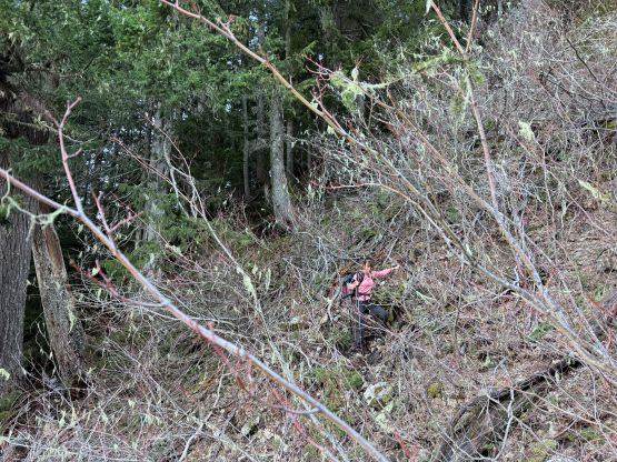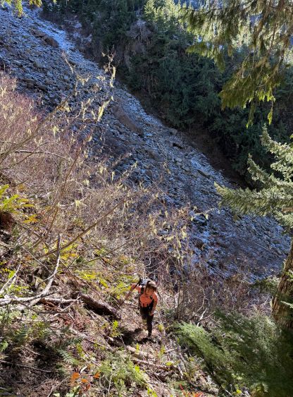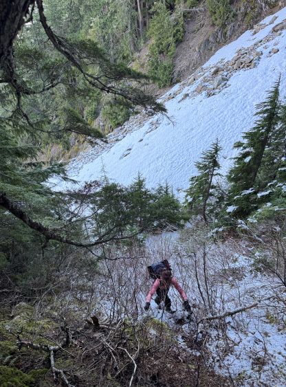 The east aspects were quickly deteriorating so the decision was made to take a break after down-climbing the ridge. We took a variation line opting for a more exposed snow traverse instead of a mixed step, which was better or worse. Plunging down into the “upper draw” was fast and furious but my aluminum heel pieces were again, not biting very well. I nevertheless was able to plunge facing outwards the entire way, but it was on the edge of my limit. Lower down we both opted for a long glissade. Descending through that lower gully constraint wasn’t too bad but the final traverse was unpleasant with the less-than-ideal crampons. I decided to keep the mountaineering boots on until we were completely done with the fresh snow, which was below that lower boulder field gully. We also stayed closer to the GPX tracks on the descent and managed to avoid the worst of the alders, but the trade-off was two nasty gullies to cross. Each of them had some Devil’s Clubs so I’m not sure if we actually found the right way. Anyway we crossed path with the climber’s trail and dashed back to the vehicle in a single shot afterwards. Our round trip time was just over 7 hours which was as expected. Elise did most of the driving homewards so that I could catch up with some sleep. I indeed got back to White Rock in time for dinner, and then worked till 10 pm.