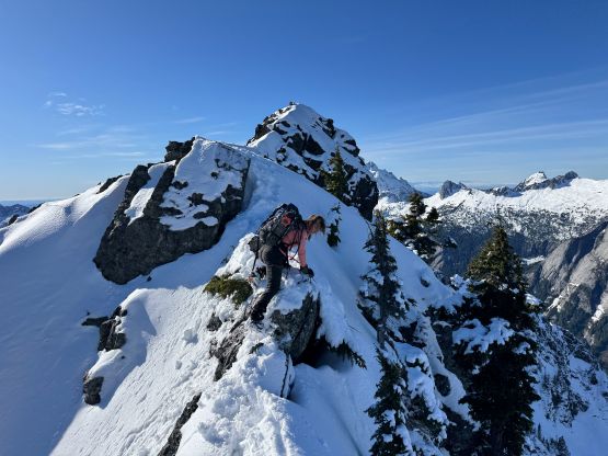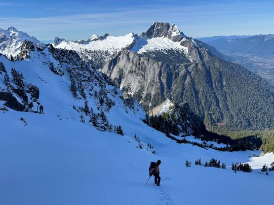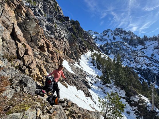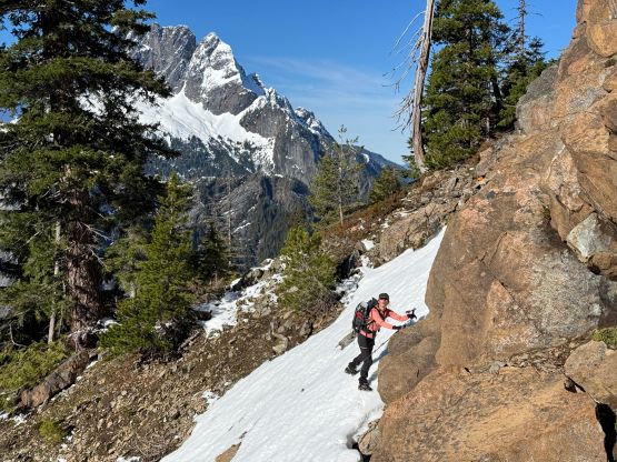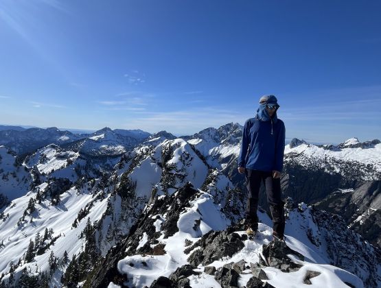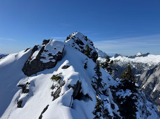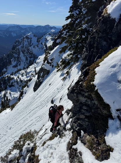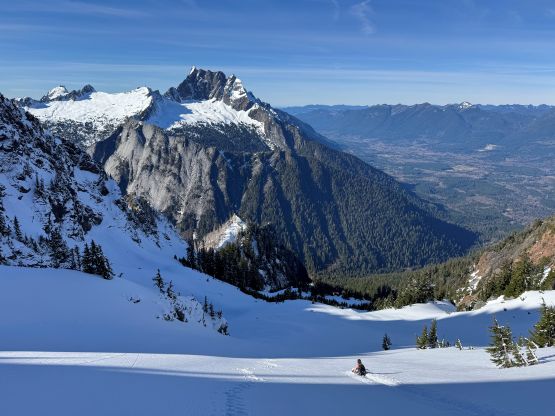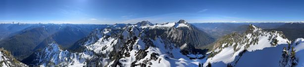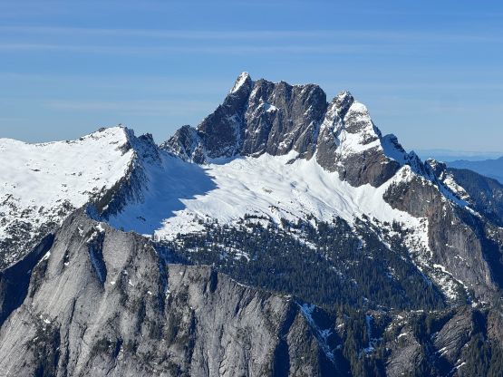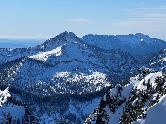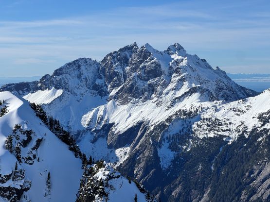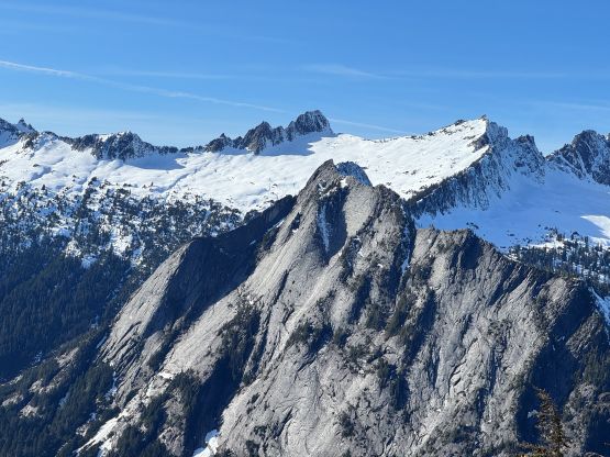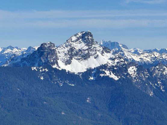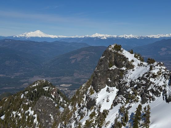 The rugged massif of Jumbo Mtn. boasts over 500 m prominence rising above the town of Darrington but is significantly overshadowed by the taller and more iconic neighbour, Whitehorse Mountain. This is unfortunate because Jumbo Mtn. itself is a fine mountaineering destination in its own. There are multiple peaks with the highest one at the center. The standard route is best done with some snow coverage to facilitate the forested travel but the route is a class 3 knife edge, that could be somewhat challenging in snowy conditions. It’s important to figure out the route beforehand because those who ended up being on the north summit would likely require a rope to traverse to the main one.