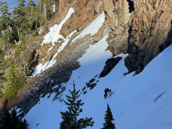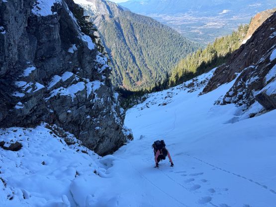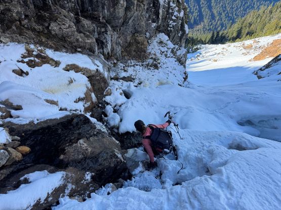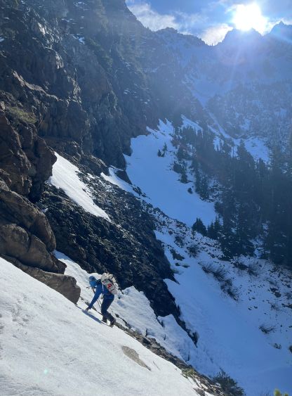 We got there just in time for the sunshine so we did the first long break of the day switching footwear. I originally was thinking to bootpack but this quickly became a dumb idea. The snow was very icy and also somewhat exposed. I then made the decision for us to don crampons and in retrospect we should have donned ice axe as well, as the exposure was quite real. The aluminum heel pieces were definitely a liability on this day so I must be 150% more careful about the biting. The terrain became more advanced as we made our way into the gully constraint so I ditched a pole and took the ice axe out. The gully wasn’t even fully filled in. There’s a melted-out gap in the middle which proved to be somewhat problematic, but a few mixed moves and some 40-degree climbing later we exited the gully into the upper draw.