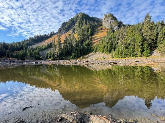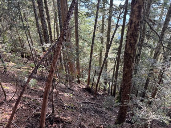 I opted to not bother setting up an alarm as I really needed to wake up naturally. This turned out to be 8:40 am which was later than I expected. I decided in situ to skip breakfast so managed to start walking in less than 15 minutes after waking up. I had read Matt’s trip report and the decision was to take Matt’s descent route to minimize bushwhacking, even though this option added some extra elevation gain and loss. The bushwhacking from the end of the road was still unavoidable and the brushes were wet, but as soon as I started up the forest the bushwhacking eased. The forest was as steep as documented in Matt’s trip report. It was a tad bit treacherous in the trail runners given the amount of pine needles and the hardpacked ground, but that’s not a problem for me. I thought about doing my own variation higher up but decided to follow Matt’s route to check out Bald Lake. This required losing all of the hard won elevation so I decided to explore my own way out on the way back. Bald Lake was disappointing as the lake was almost entirely dry at this time of a year. I did manage to take a few satisfactory photos but the scenery was rather mediocre in person.