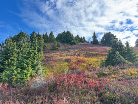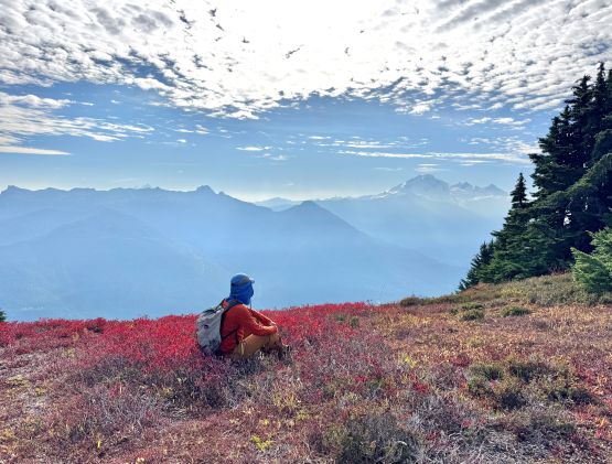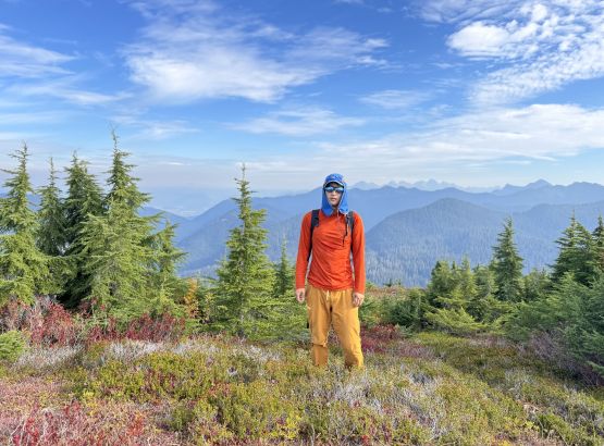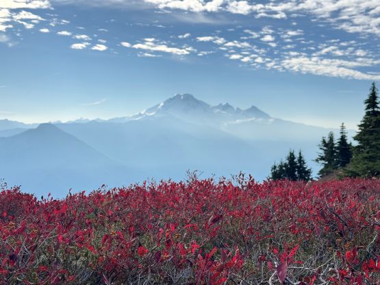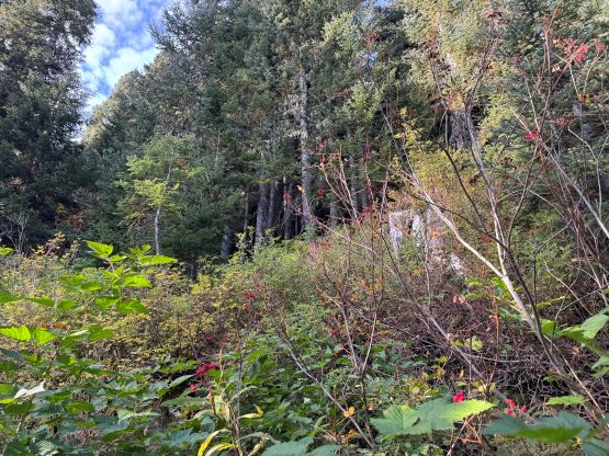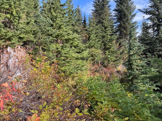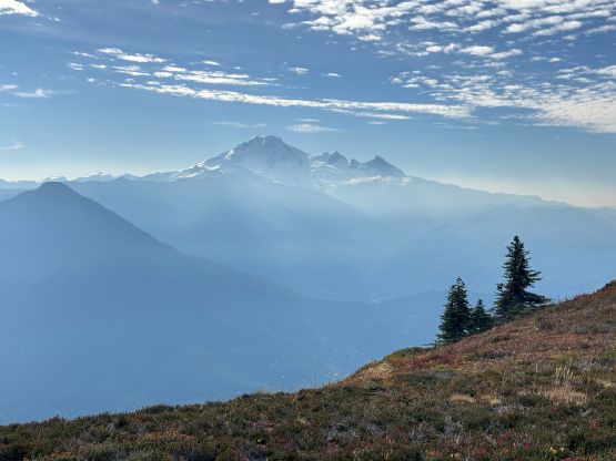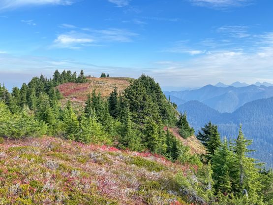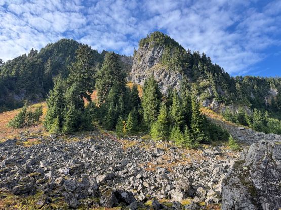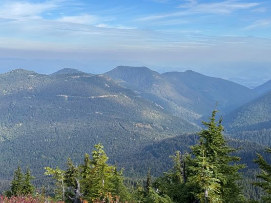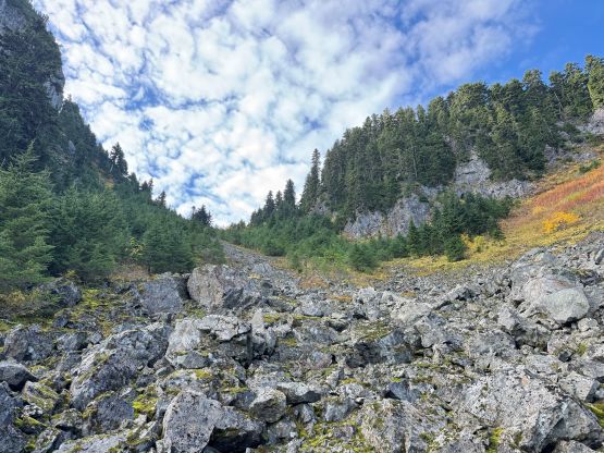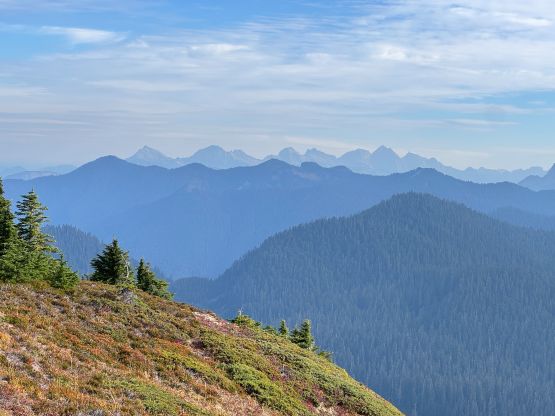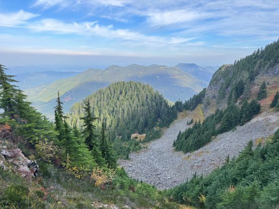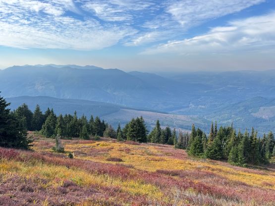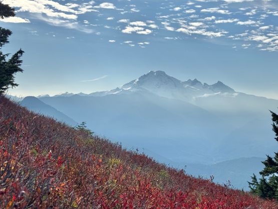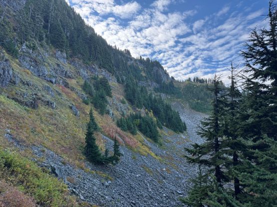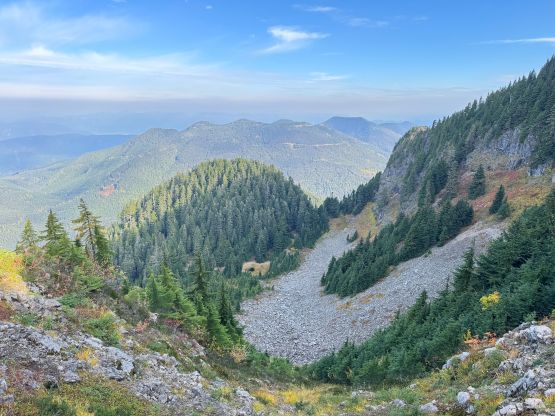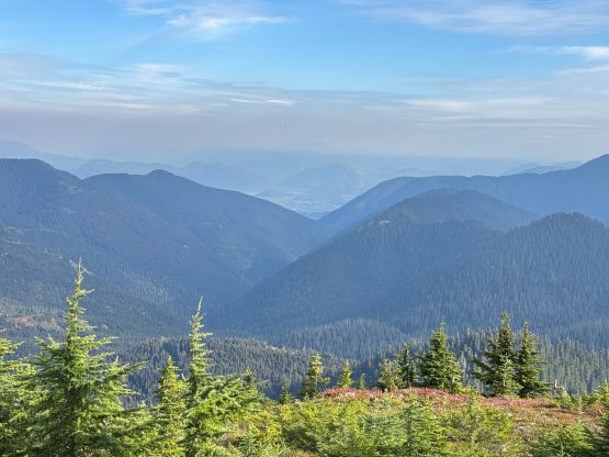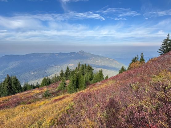 The bushwhacking above Bald Lake was worse than I thought with a band of BW4 that I had to penetrate through. I probably didn’t pick the easiest way but I was too lazy to search around. The forest was also quite steep so the going was slow and unpleasant until I emerged in the boulder fields. The boulder fields felt like a “highway” by comparison so I quickly worked my way around to the north side gully. This gully was filled with brisk sized rubbles and most, if not all of the rubbles were loose and covered in moss, and the vegetation was wet and greasy. The going was fairly treacherous but again, I was experienced and able to move efficiently in this type of terrain. Traversing across the west side bowl was also side-hilling on rubble-fuck and boulders and then there’s a gully of compact choss to ascend. This gully was quite shitty and I ended up needing a few vege-belay moves. Thankfully by wrapping around to the SW side of Kaisoots Mtn. the final attack to the true summit was scenic and straightforward. There were still huckleberries available and the fall colours were still full on, but unfortunately the weather was smoky.