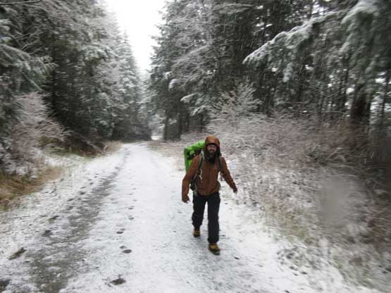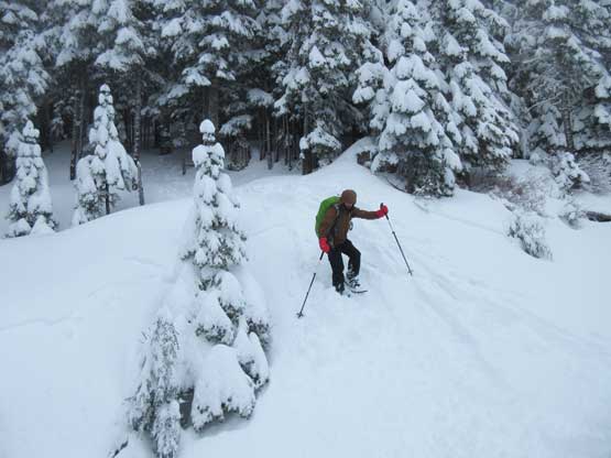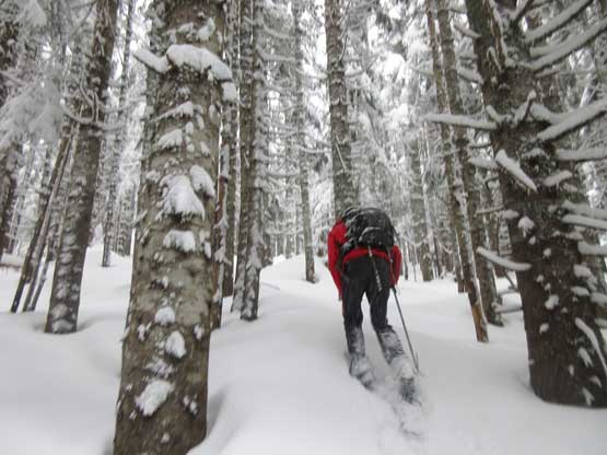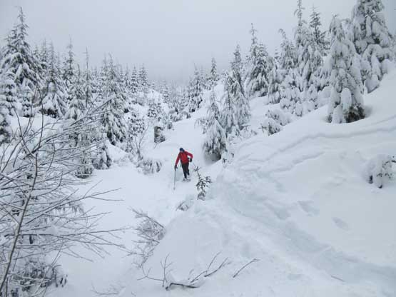 This is a trip that one would better come prepared with a downloaded, or at least a pre-drawn GPX track. There’s so many confusing branches but generally speaking for the lower 2/3 one just needs to follow the most obvious path. The logging road does about a dozen switchbacks up the flank between Thunder Creek and Mills Creek. The weather was horrible but at least after a couple hundred meters elevation gain the rain had transitioned into (wet) snow. At about 900 m elevation we strapped the snowshoes on and then there came that “bushy connector”. This is a narrower and bushier branch that’s hard to discover if not because of the online beta and GPX track. It led us traversing diagonally due south-east for at least a couple kilometers. Meanwhile we had to push around the alders with fresh snow…
