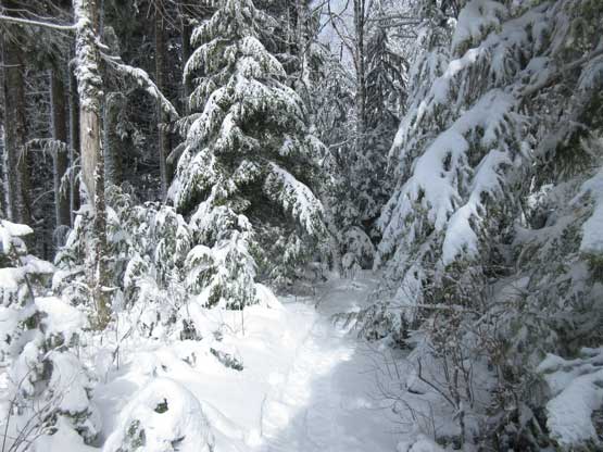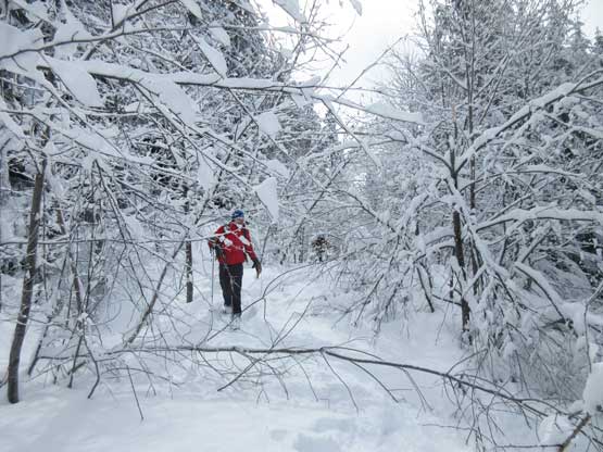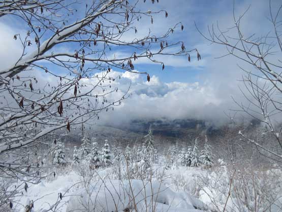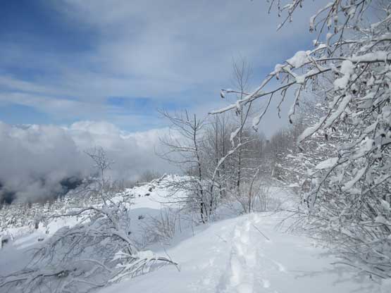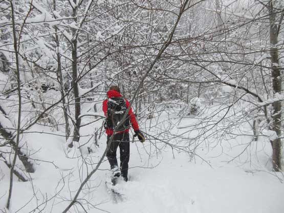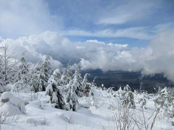 The summit stay was short thank to the absolute white-out conditions. Even the top of this communication tower wasn’t visible and that tells how “awesome” the view was. It’s still snowing fairly heavily so not wanting to waste too much time we started the descent. Downhill snowshoeing in this powder form of snow was fast and fun so in no time we were back to that “bushy connector”. While descending this connector we actually got some nice views thank to a brief clearing trend to the west. But the blue skies didn’t last long as a thunderstorm clouds rolled in as we continued our descent. For the last few kilometers we were hit heavily by a rain/hail storm and soaked to the bone…