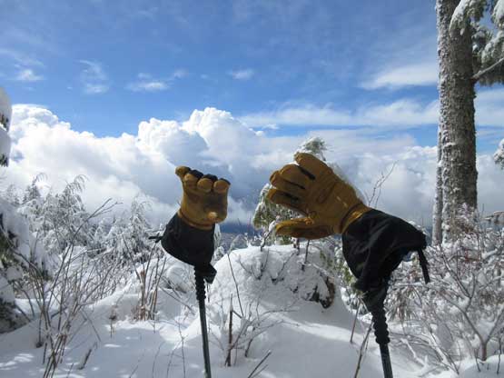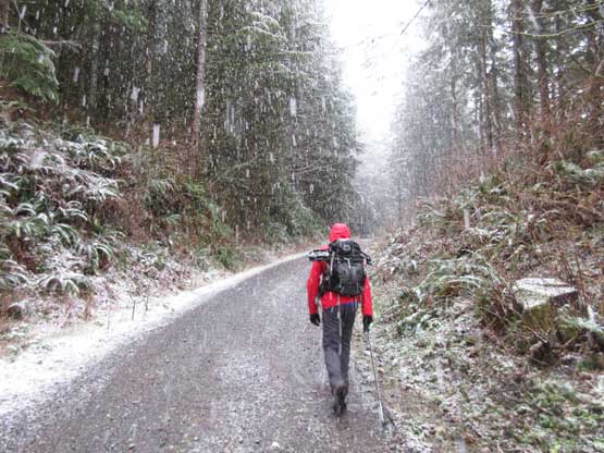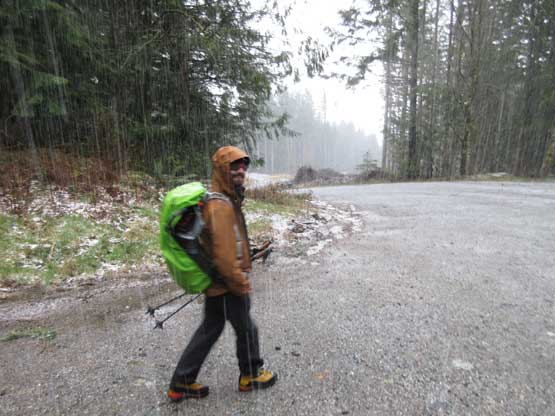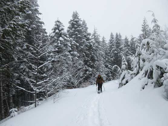 This is a trip that one would better come prepared with a downloaded, or at least a pre-drawn GPX track. There’s so many confusing branches but generally speaking for the lower 2/3 one just needs to follow the most obvious path. The logging road does about a dozen switchbacks up the flank between Thunder Creek and Mills Creek. The weather was horrible but at least after a couple hundred meters elevation gain the rain had transitioned into (wet) snow. At about 900 m elevation we strapped the snowshoes on and then there came that “bushy connector”. This is a narrower and bushier branch that’s hard to discover if not because of the online beta and GPX track. It led us traversing diagonally due south-east for at least a couple kilometers. Meanwhile we had to push around the alders with fresh snow…