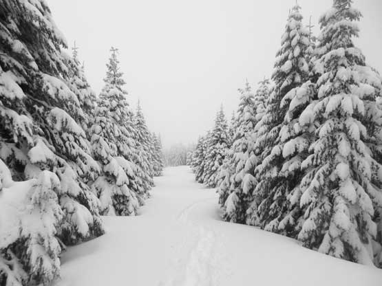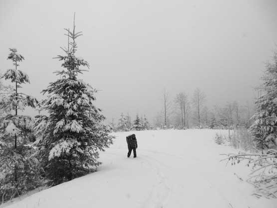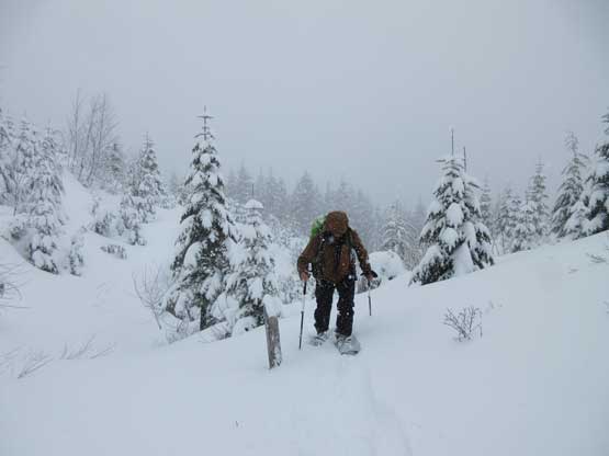 The summit stay was short thank to the absolute white-out conditions. Even the top of this communication tower wasn’t visible and that tells how “awesome” the view was. It’s still snowing fairly heavily so not wanting to waste too much time we started the descent. Downhill snowshoeing in this powder form of snow was fast and fun so in no time we were back to that “bushy connector”. While descending this connector we actually got some nice views thank to a brief clearing trend to the west. But the blue skies didn’t last long as a thunderstorm clouds rolled in as we continued our descent. For the last few kilometers we were hit heavily by a rain/hail storm and soaked to the bone…