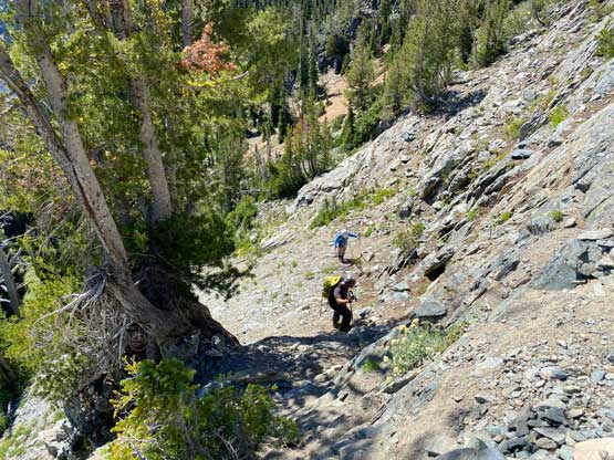 Prior to the trip I only researched Bonanza Peak but did downloaded a GPS track for both Martin Peak and Copper Peak. I assumed the others would have done their detailed research and I also assumed that we could easily onsight the route-finding by following the GPS track. It turned out that I was a little bit too optimistic about Martin Peak. Immediately above the camp we picked up a set of climber’s trail on the climber’s left side and easily plodded up and over a long ridge bump with some micro-terrain. On the far side of this bump we had to lose about 50 m elevation and then the game began. Upon arriving at the bottom of the first obvious steep buttress we followed the GPS track traversing southwards a long ways until finding a easy, but loose gully to ascend back onto the ridge crest. The traverse was done a bit higher than optimal so we gained and lost more elevation than absolutely needed. There were already some class 3 scrambling here and there to get back onto the ridge crest and we all started to get a taste of the looseness of this peak.