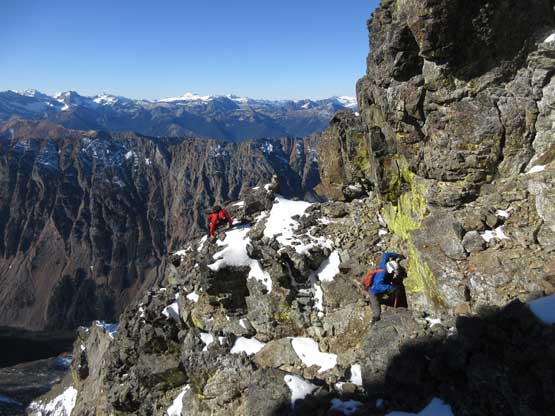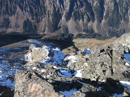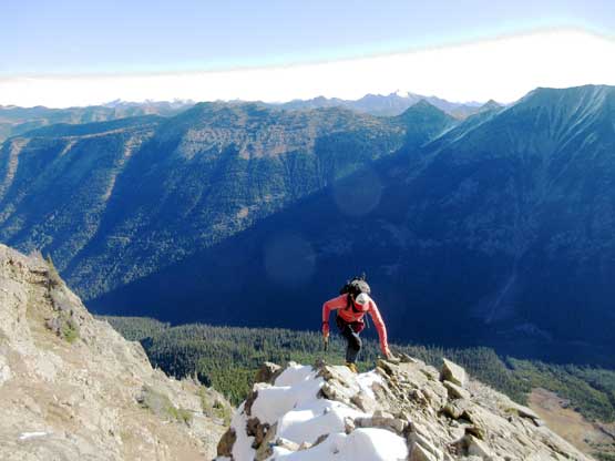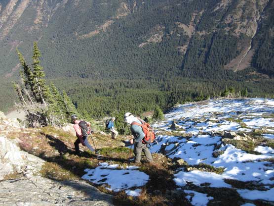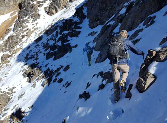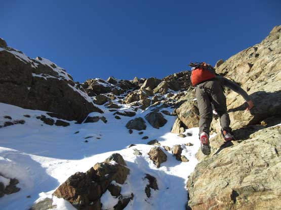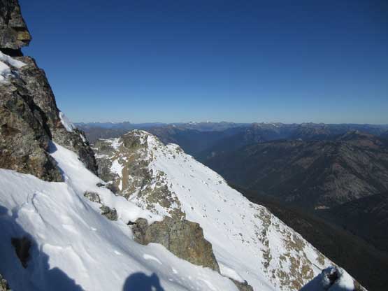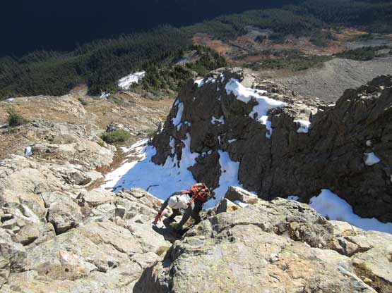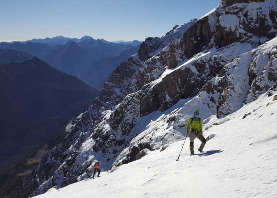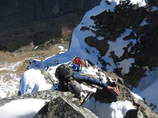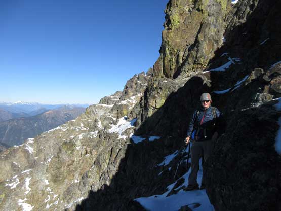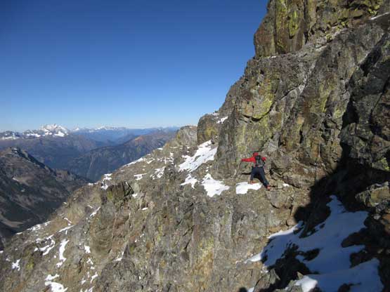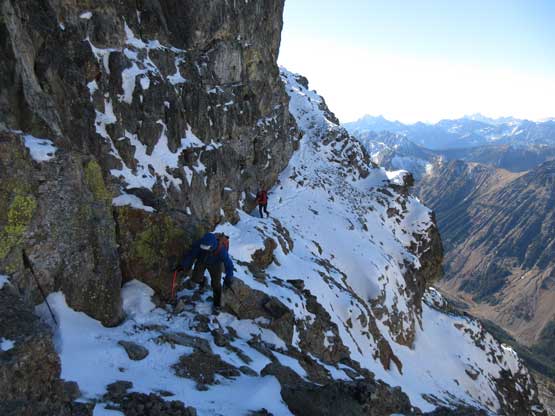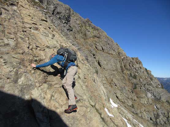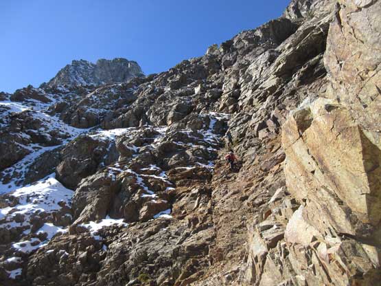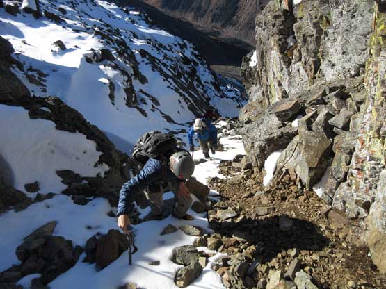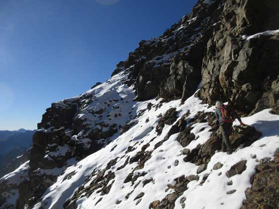 The upper face was considerably mellower than the lower face as the slope angle eased off. The downside was more fresh snow but honestly speaking I thought the snow made things easier especially on the last stretch slogging to Ballard’s high col. Without snow I’m sure that part would be treadmill scree but all we needed was some step-kicking. At the high col we donned crampons and took the axes out. I led the way staring the narrow ledge traverse on the west face. This ledge looked awfully scary but actually not at all. It was wide enough to walk across and the exposure was pretty mild for the whole stretch.