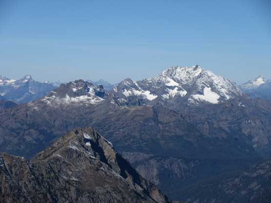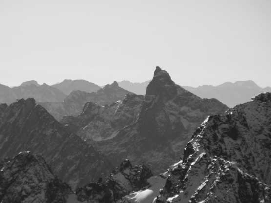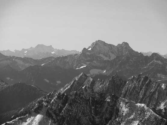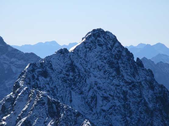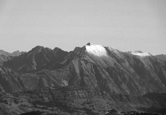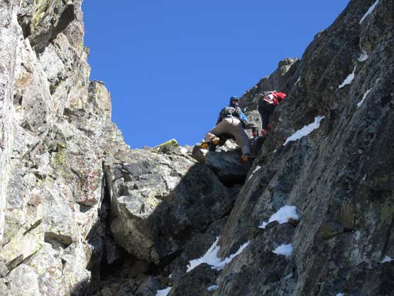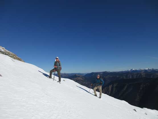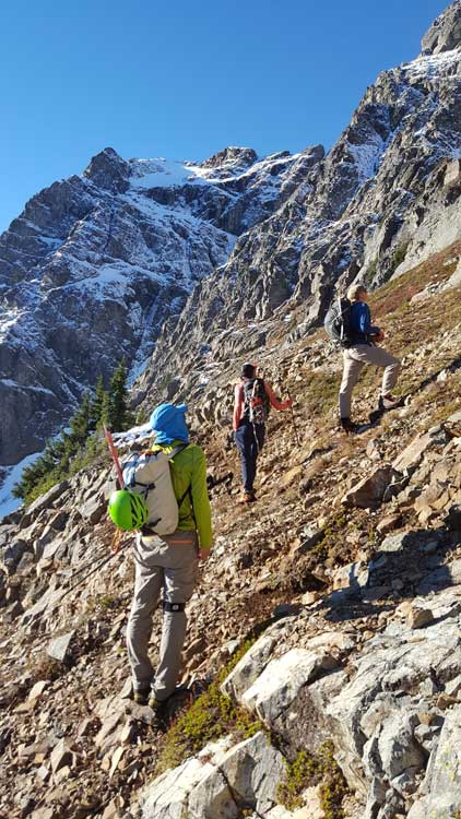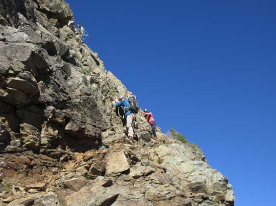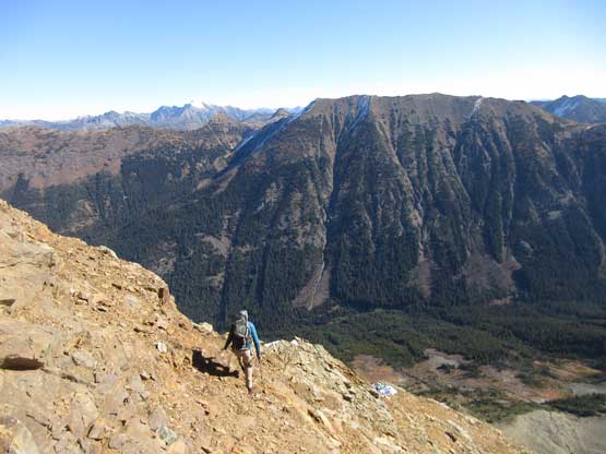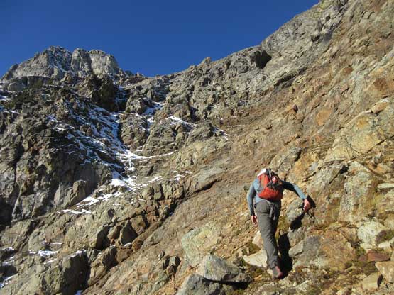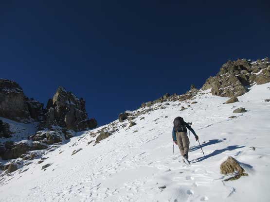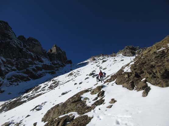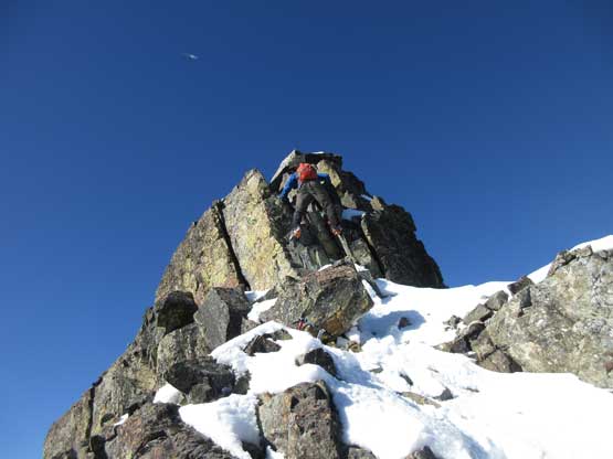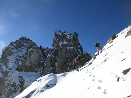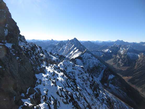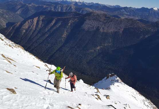 The upper face was considerably mellower than the lower face as the slope angle eased off. The downside was more fresh snow but honestly speaking I thought the snow made things easier especially on the last stretch slogging to Ballard’s high col. Without snow I’m sure that part would be treadmill scree but all we needed was some step-kicking. At the high col we donned crampons and took the axes out. I led the way staring the narrow ledge traverse on the west face. This ledge looked awfully scary but actually not at all. It was wide enough to walk across and the exposure was pretty mild for the whole stretch.