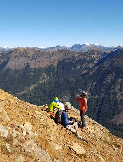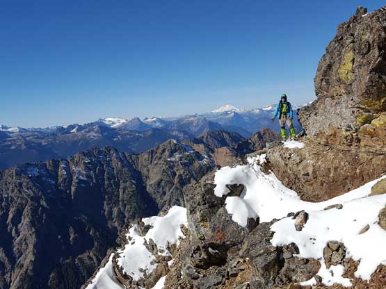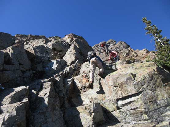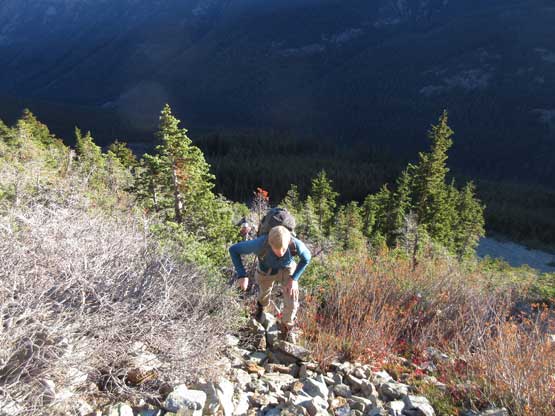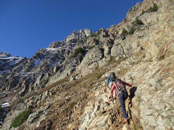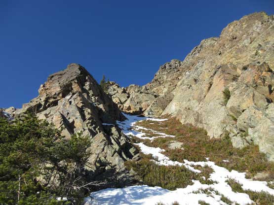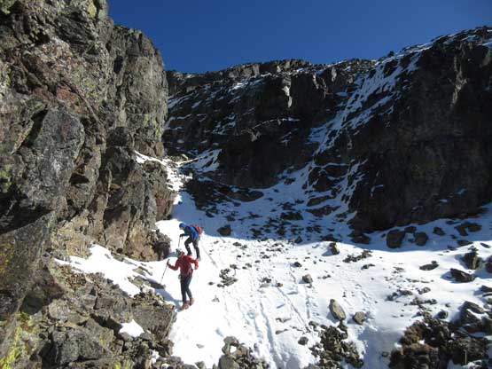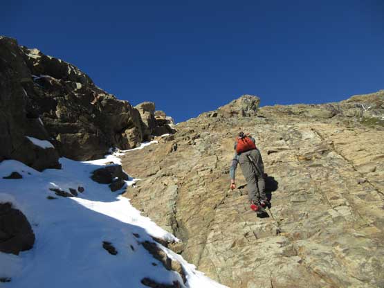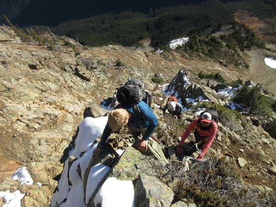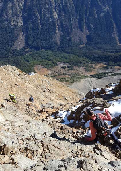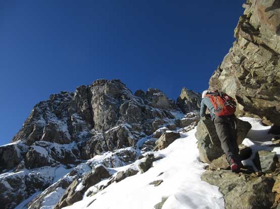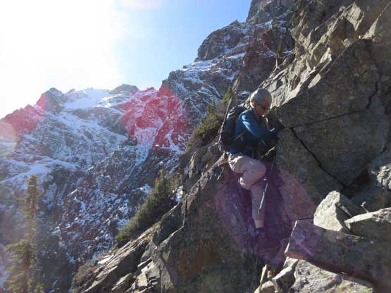 The “green slot” marked where the real scrambling started although the slot itself wasn’t very obvious. On the ascent we climbed a slippery 3rd-4th class vege chimney that might actually be the “green slot” but such complication was entirely bypassed on descent, on climber’s right side. Above the vegetation gully we gained a rib feature and stuck more-or-less on the ridge crest. The scrambling was sustained and somewhat exposed, but never exceeded the realm of “3rd class” with careful route-finding. We did encounter a few 4th class steps but I believe all of those could be bypassed, if we had to. Fresh snow did make scrambling spicier but was far from show-stopping. Before long we were at the base of that horizontal ledge traverse out climber’s left (south). The ledge was completely covered in snow but despite that, it was easy peasy and then we were on the upper half of Ballard’ E. Face.