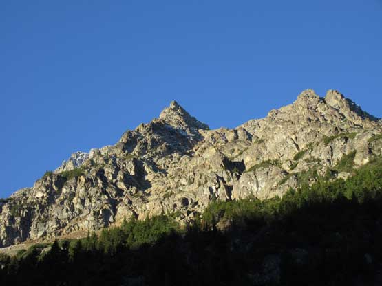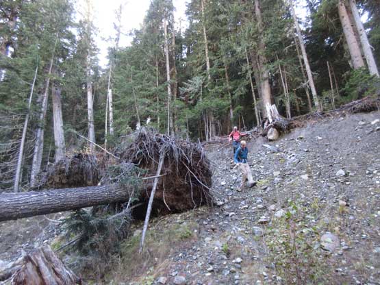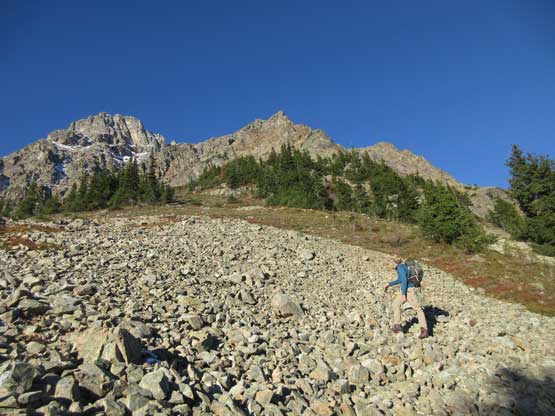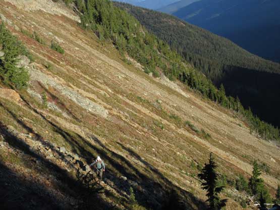 The next morning we all woke up on schedule and managed to get going when it’s still pitch dark. The first stage was following the deactivated Slate Creek Road’s south fork for about 1.5 miles to a bridge crossing the creek. This section went by without event and it’s also here that we no longer needed headlamps. The second stage was bushwhacking in mostly open forest on a slightly uphill traversing line. This section was mostly done by GPS navigation and the aim was at a boulder field at elevation of 1500 m. Crossing the boulder field at this elevation avoided unnecessary alder thrashing and then we continued the southwards orientation overcoming a short, but steep forested roll. The treeline zone had the most sustained bushwhacking in this trip but it’s nothing by BC standard and the next thing we were right under the massive E. Face of Mt. Ballard staring at our objective. It looked pretty complicated.