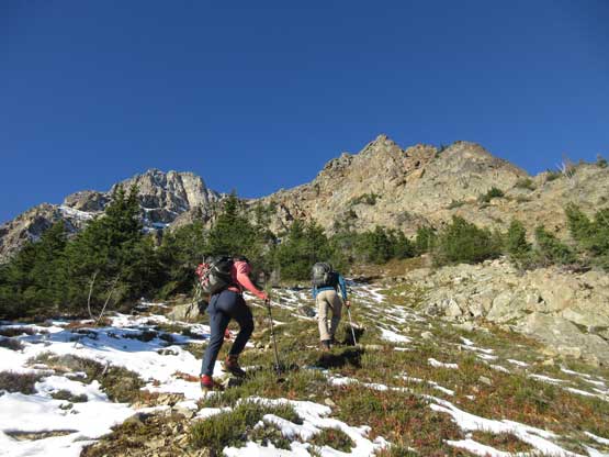 From where we existed the worst of bushwhacking the next stage was to gain the rib farther to the south. That would be the official start of Ballard’s east face route. This part involved a long ass side-hill traverse on frozen choss aiming at a break in the steep bluffs, but as complicated as it seemed we had excellent beta on NWHikers. The route description was pretty much bang on. Once making sure we were on route we took the first lengthy break of this day. Then upwards the lower route started off with mostly class 1 or 2 on increasingly steep terrain.