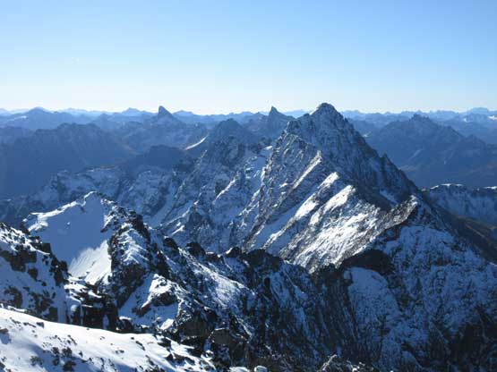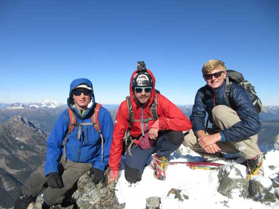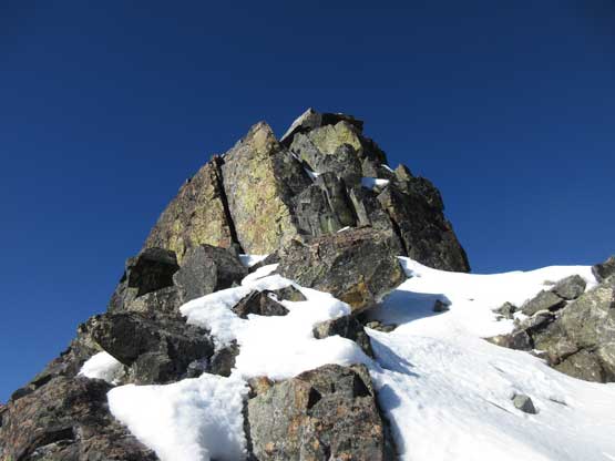 To gain the summit we had to ascend an obvious gully chocked with snow. This gully was also easier than expected although the crux step was sort of awkward on crampons. It involved a solid 4th class move but the exposure was nothing. The summit block had some big steps on solid holds and soon enough we were all on top. There weren’t a lot of room to fit a group of four. We took a lot of effort trying to dig the register out but nope…