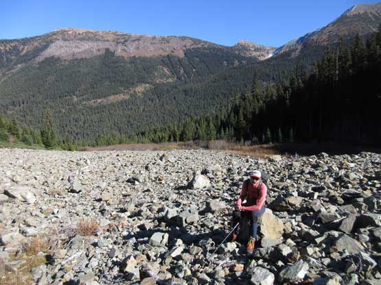 The summit was a cold spot to linger so instead of digging the whole cairn out we decided to descend. Down-climbing the summit block was interesting on crampons and so was the crux step in that gully. Traversing back across the west face’s ledge was fast and fun and plunging down the upper east face on snow was even more fun. In no time we were down to the scrambling sections and thank to the warming-up the rocks weren’t nearly as slippery as in the morning anymore. We still had to pay extra caution on some moves but the descent was overall easier than expected. Not to mention that we also bypassed the “green slot” at the bottom. Navigation in the brushes wasn’t fun by comparison but at this point I decided to let the GPS technology doing its job, and it sure did not disappoint. The final 1.5 miles walk on the deactivated south fork of Slate Creek Road was boring and I sure wished I brought the trail runners for that.